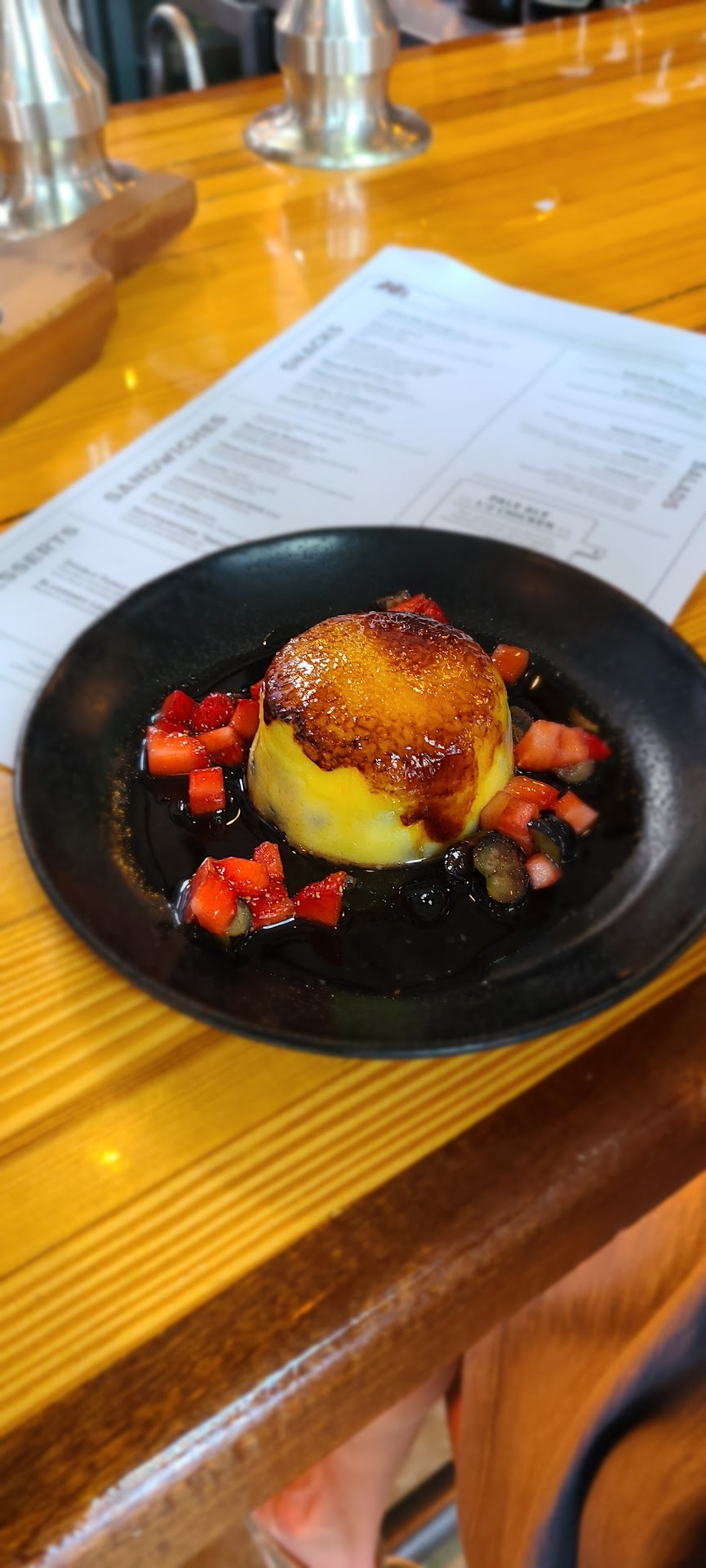The creme brulee actuallit was served out of the ramekin [similar to a flan] and served with some cut up blueberries and strawberries on the side with some summer berry sauce. You don't get too much of the lemon though. It was good but a little thicker than your standard creme brulee. Had some blueberries baked in.