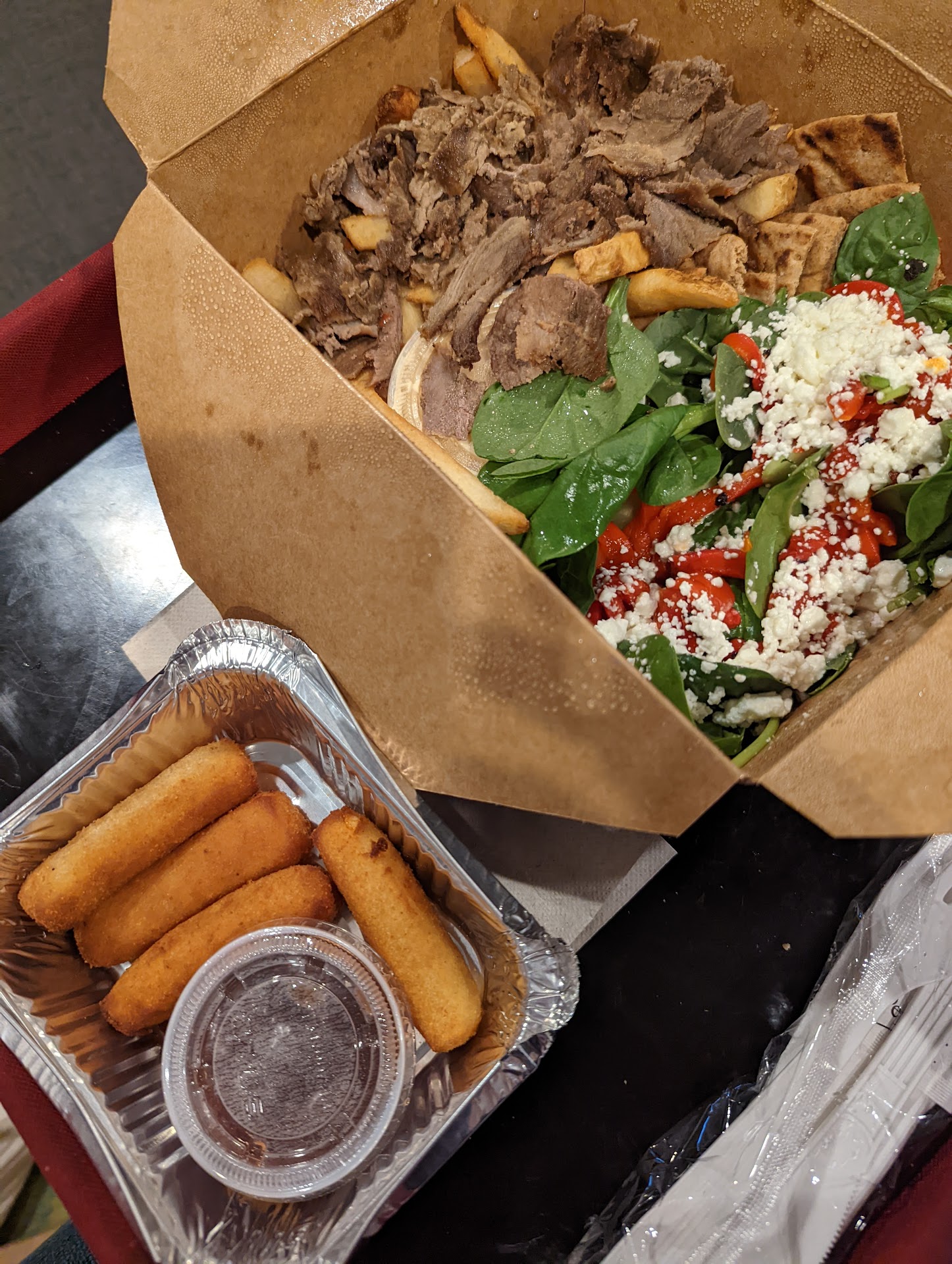 Portion was generous but the plate had some problems. The gyro meat was very dry which was disappointing. I added some of my own tzaziki which helped a bit. The fries were completely soggy (and I'm only 10 minutes from restaurant) as was some of the pita. The cucumbers were weirdly warm because of the hot meat on top of the salad. I'd recommend they package this differently for to-go orders separating the hot and cold items. Otherwise, spicy feta dip and rest of flavors were ok, but nothing I'd crave.