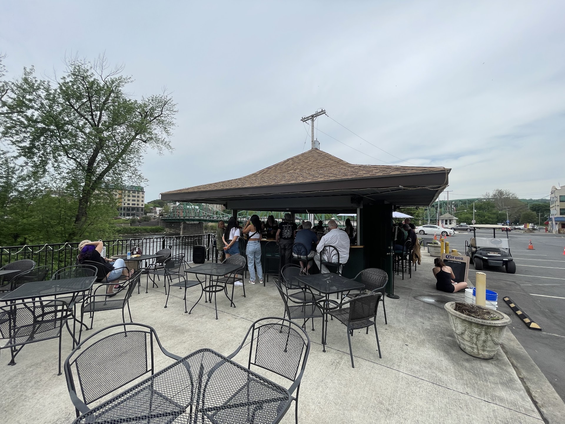 A great watering hole located in "P-burg" if you're a local. There are amazing views of where the Lehigh river meets the Delaware river. This is very popular in the warmer months with a large cover deck and an annex pavilion bar with outdoor seating under a canopy of huge trees even closer to the river with views of the historic free bridge as it is called. Simple good hot and cold food is available from the connected neighboring restaurant that will deliver to you provided you order at their register. Also in the warmer months get ready for the tubers and kayakers as they exit the river right there after day excursions that the shuttles took them from earlier. The bartenders are always friendly and promote a fun easy outgoing attitude. Outside is dog friendly so don't be surprised if you see family's with dogs while enjoying the car and motorcycle show from the patrons who bring out...