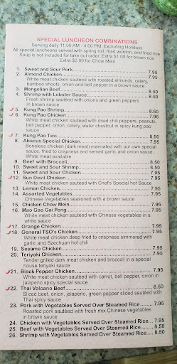 Read moreI used to love this place, have spent lots of money there, however when I dropped in for a late lunch early dinner I was shocked by the Service and Food: When I got my spicy soup it was more like gelatin, I asked why was it so thick, server suggested I add water? Then when my crab puffs came they were brown, burned actually, I asked for another order server explained he couldn't give me another order of crab puffs asked for fresh wonton for soup server told me he can't get me fresh wonton chips because they cook them ever 2-3 days ahead and I was being served on the bottom of container!? I wouldn't eat those, the server assured me this is the way people liked them, I assured the server that's NOT the way I like them he then proceeded to ask if I'd like to cancel my order, said no, but then I re-thought and wondered at what point will the food become better? So I cancelled my order asked the server what's happening here, why is the food so bad informed him I've eaten at Abacus numerous times and had never been treated so badly, I was uncomfortable, told server I'm not paying for gelatin soup or burned crab puffs, I walked over to front desk spoke to a young girl, she apologized profusely, told her I didn't eat anything asked did restaurant get a new cook, she said yes, asked for manager or better yet an owner, however no owner or manager available, asked to please explain to owner that he lost a good customer the worst Chinese Food I've ever almost had..Server gets a -0 food -0 Good...