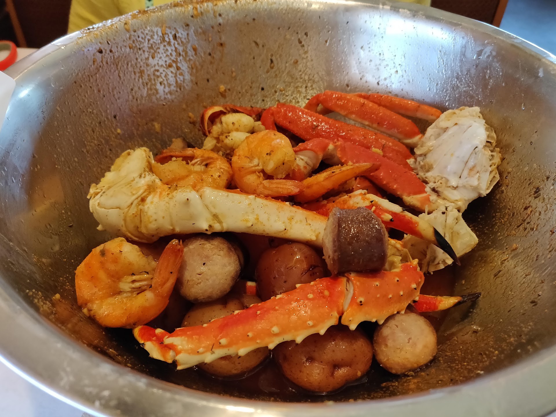 Food: 5/10. Just okay. The shrimp felt overcooked, the king crab felt old or maybe just not fresh. It would not have been so frustrating if it hadn't cost $125 for the boil for two (before tax/tip). It didn't quite feel worth the price, and I felt a bit let down. The spice levels are also overstated-- the hot felt like black pepper. The spices themselves were pretty bland as well, very disappointing because we even selected the trifecta (cajun, lemon pepper, garlic). Either there just wasn't enough seasoning, or else they just call Old Bay cajun. Drinks were very nice, however-- I had both a sweet peach lemonade and a western son mojito, and regretted neither.