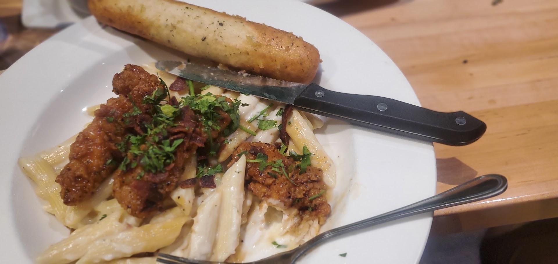 We decided on the "2 for $34" option of the mozzarella sticks appetizer and we both ordered the "four cheese mac & cheese with honey pepper chicken". The mozzarella sticks came out in a decent time period. However, it did seem that our entrees were taking a little longer than usual. When our plates arrived, neither of us were given the bread stick. We had to ask Amy to make sure the kitchen forgot. The manager on duty did come by to apologize for the oversight and assured us they would be right out (which they were).