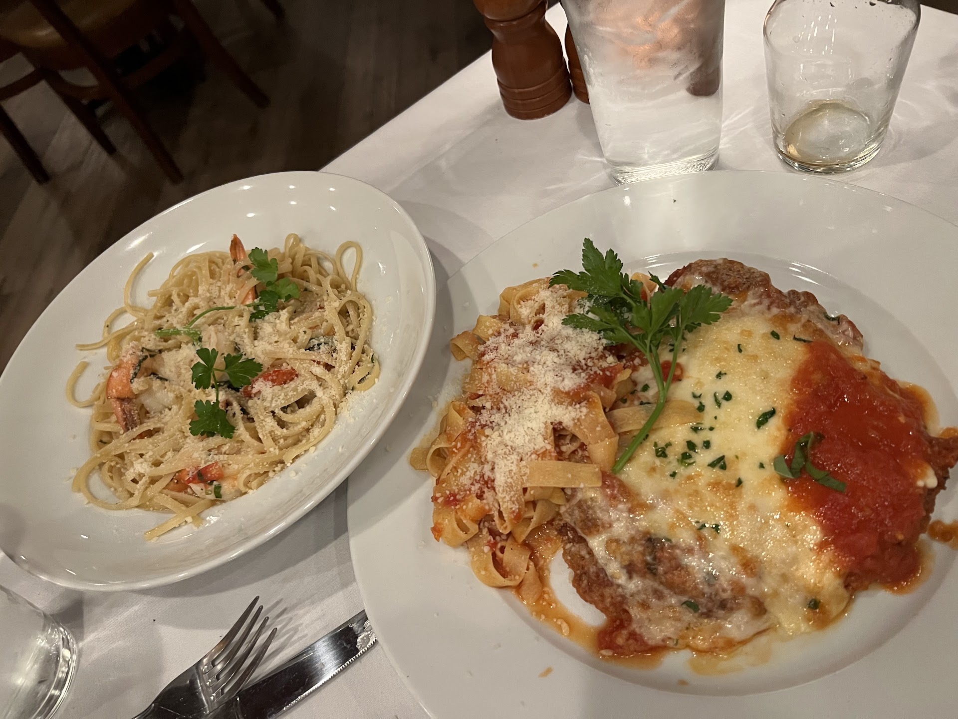 Read moreMy husband and I had a Groupon and were able to pop in here on a Friday night with a last minute reservation. It was packed. While we were pretty shocked given COVID, we were too hungry to go elsewhere. We were seated in a corner and were able to choose chairs at our table for four away from others. We were greeted promptly and ordered beer. It was served within a few minutes. We put in an order of calamari. I think it fell a little flat. It was pretty salty and over cooked because it was chewy. It went downhill from there. We put our entree order in. My husband ordered the spicy penne with sausage and I ordered the fish special. About 15 minutes later the waiter told us they were really busy...”lots of take out orders”...thankfully, someone came by with some rolls and offered them to us. We were starving. The rolls were great. About 20 mins more went buy and we were told your order is coming soon. At this point, half the restaurant had emptied out. It was a total of an hour and 10 minutes before our food arrived. The food was hot and my husband’s pasta looked good. My sea bass was served with egg noodles not fettuccine. I took a bite and wow, it was over salted and the breading was really soggy from the wine sauce. The dish just didn’t go together....baby carrots, green beans, egg noodles and a super salty breaded sea bass. I barely ate any. The woman came by when she saw we stopped eating and said it looks like you didn’t like it. I said ya, not really. She took my plate and walked away. My husband’s pasta and sausage was much better. I probably won’t return but if I did I would definitely only order pasta. We were glad to be able to try it...