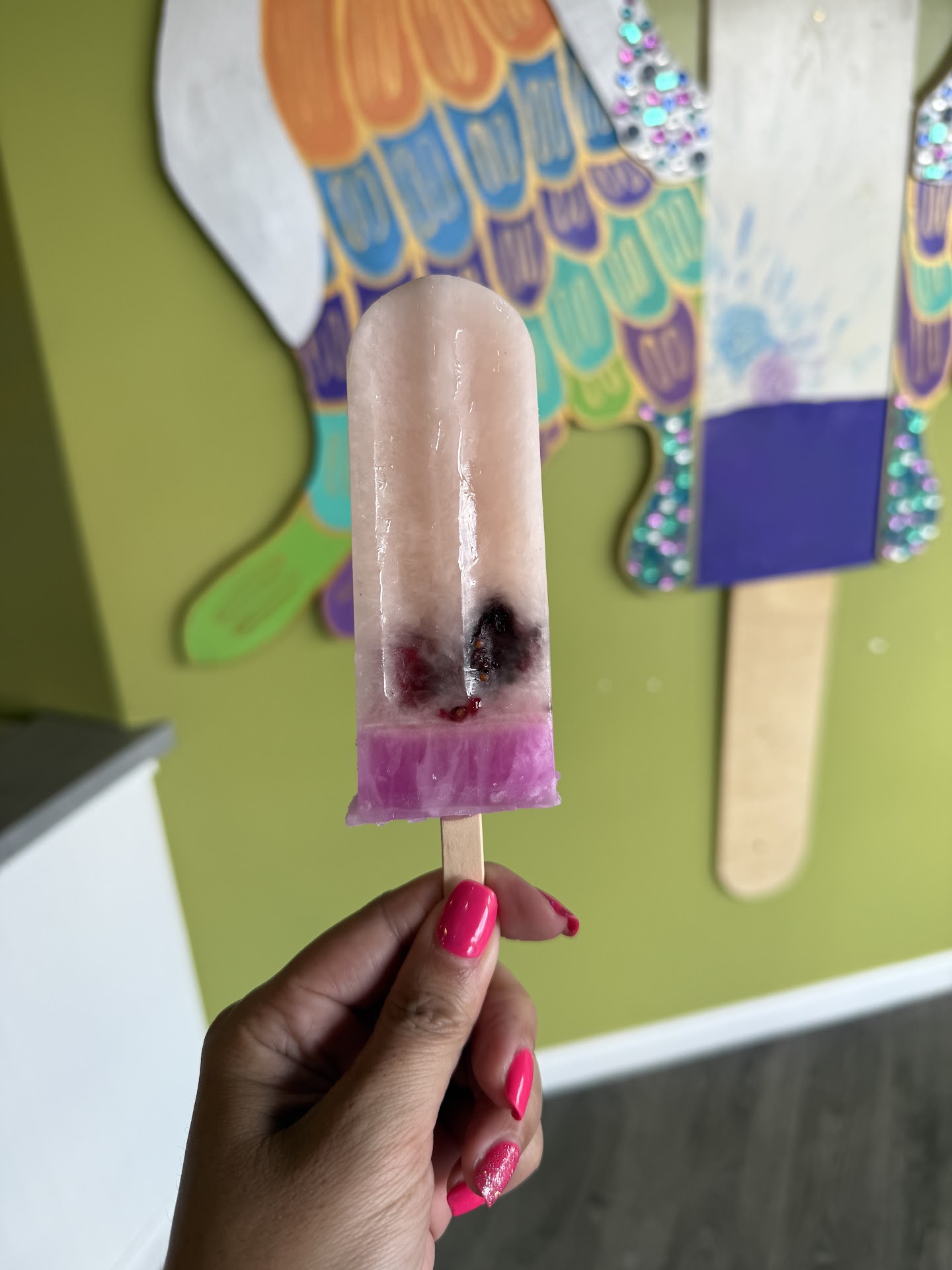 AZ Pops offers a wide array of unique, even exotic flavors that really deliver. As I write this, I’m working my way through my baker’s dozen and enjoying every bite. I scored a Lavender Berry Lemonade(photo)that was perfectly refreshing. I also had one with passion fruit and lychee unfortunately, I didn’t catch the name because I devoured it too fast. It had real lychee pieces in it! The Blue Hawaiian tasted just like soursop, which brought me right back to my childhood.