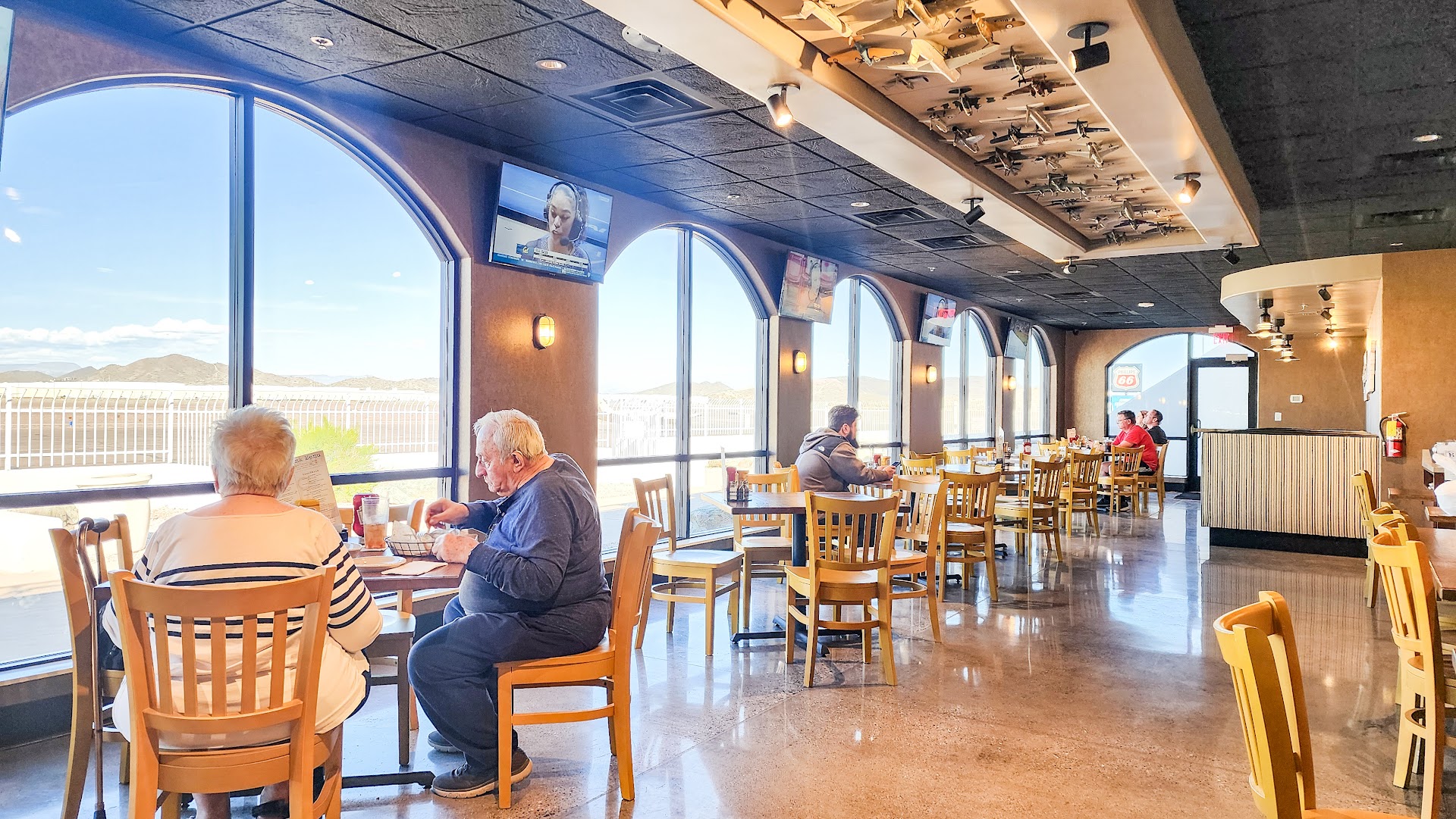There's lots of indoor seating, two tvs behind the bar, and a tabletop shuffleboard. Our favorite part is that they kept the model planes that hung in the previous restaurant. It's nostalgic, and kids love them. Currently, you can't take alcohol outside up on the deck, but hopefully, they'll get that license. Most of the seating has great views of the runway through the large windows anyways.