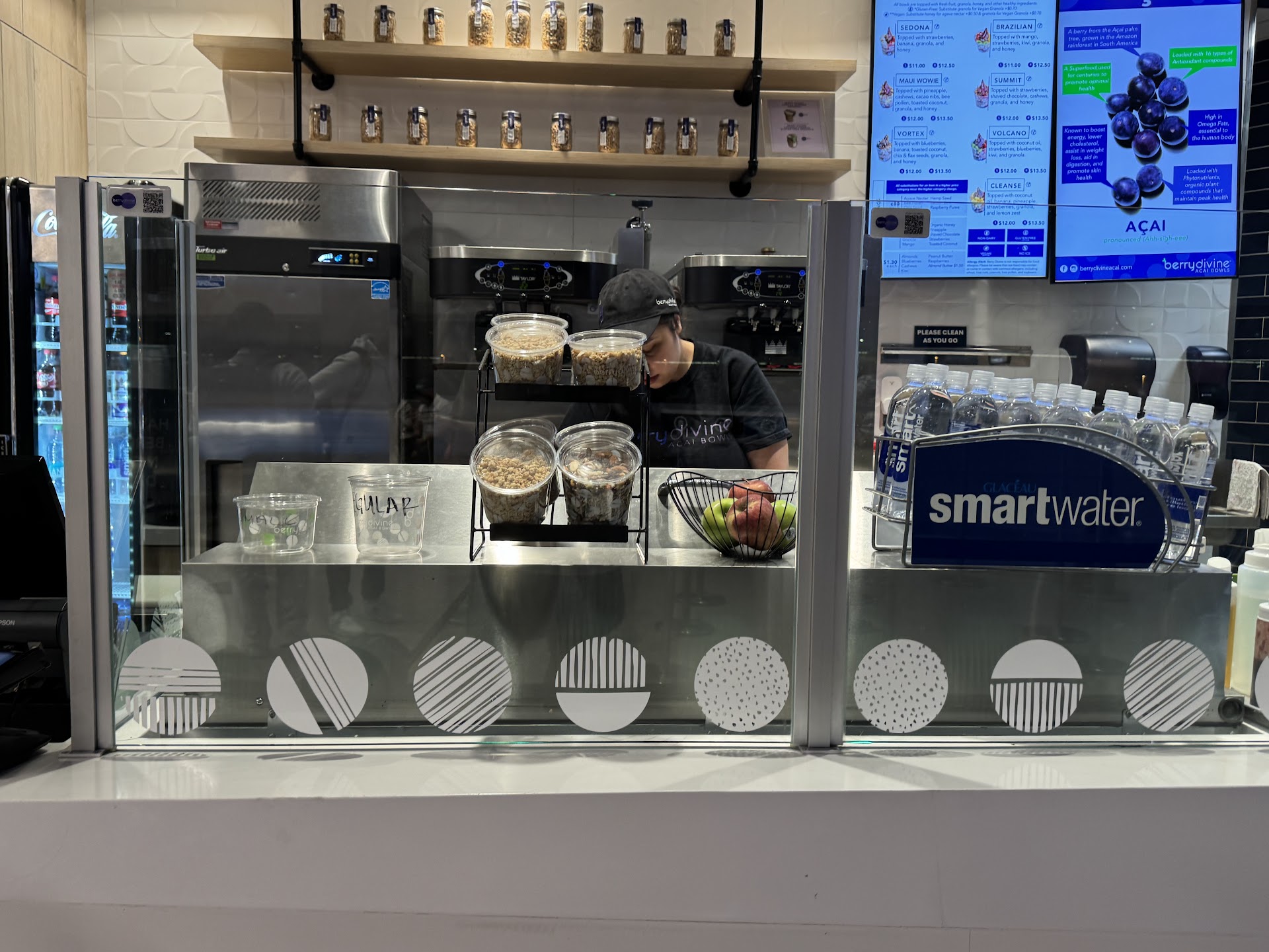 Ā Ā Ā Read moreI will start with the Acai Bowl was delicious. However, I have feedback for this location. Being this location is for people on the go, you should offer 2 things: Smoothies and lids that fit your Acai bowls. Smoothies are fantastic easy meal. Honestly I look for these at airports so I can wheel my carry on and eat my quick meal before my flight, no mess and healthy. Domed lids that fit your Acai bowls, should be a bare minimum of what you offer. I had the whole line laughing trying to fit this lid on my bowl, so I could carry it to my gate and the plane without a disaster. Not sure this was a temporary order of lids because youw ere out of domed lids. I cant imagine anyone would actually order flat lids? Summary, so excited to see this location in the new terminal 4 D gates. But also so disappointed they didn't have the type of customers front of mind. Hope this review is helpful in future...
