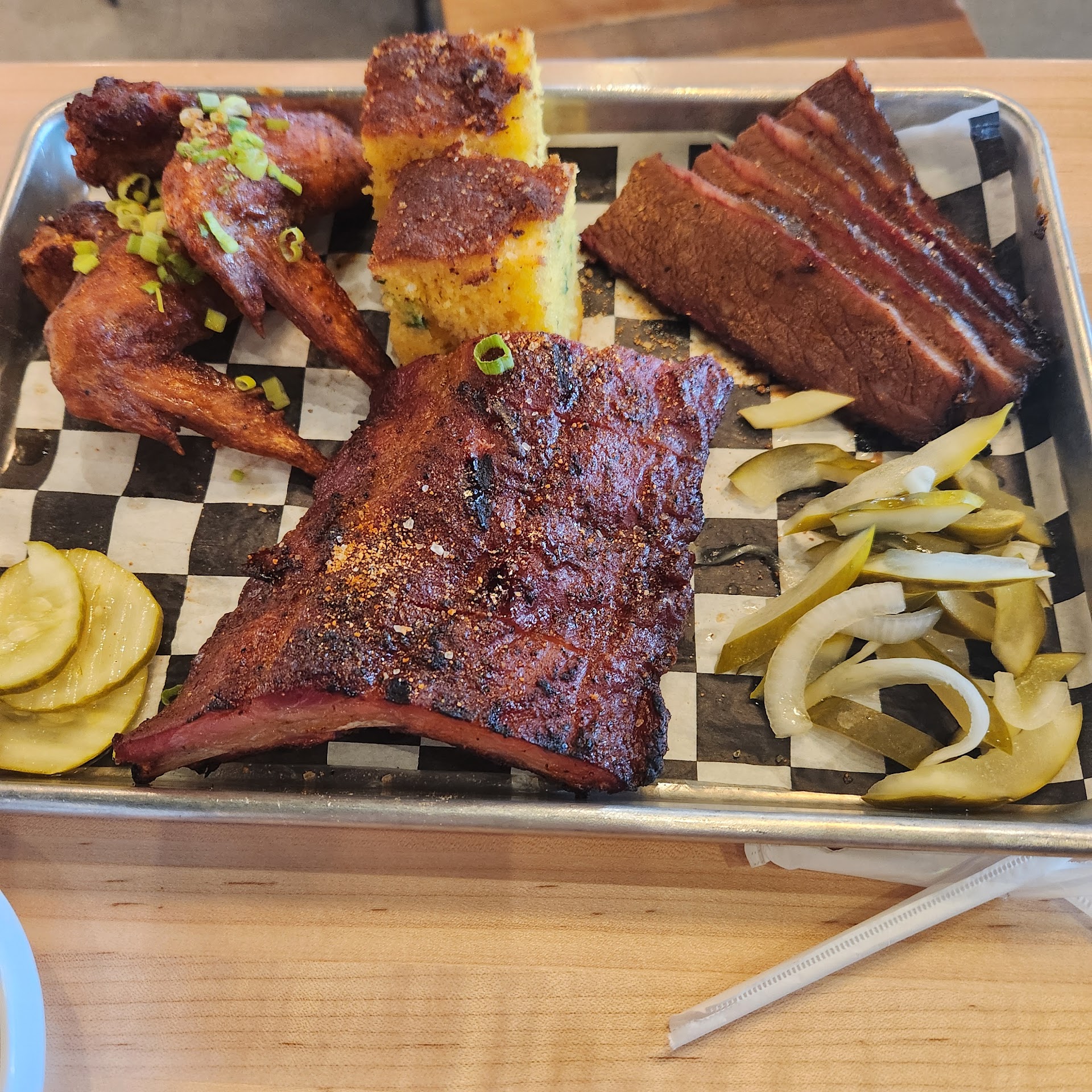 We ordered a selection of menu items and were happy with the quality for the most part. Wings and ribs were good. Texture and temperature were spot on. Brisket was a lean cut and a little on the dry side for my liking plain, but dipping in the wide selection of sauces dressed it up nicely.