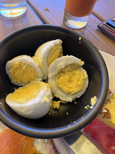 FOOD: I got a smoked salmon toast and boiled eggs. The toast was very good, but the eggs had a gray ring around the yolk, according to my research it it's a sign of been over cooked. The ring is caused by a chemical reaction involving sulfur, and it's is ok to eat but not in big amounts. So I skipped the egg. The salmon toast was very full filling so I was ok. I also got a carrot juice and it was very good but it wasn't cool enough it was more of a room temperature.
