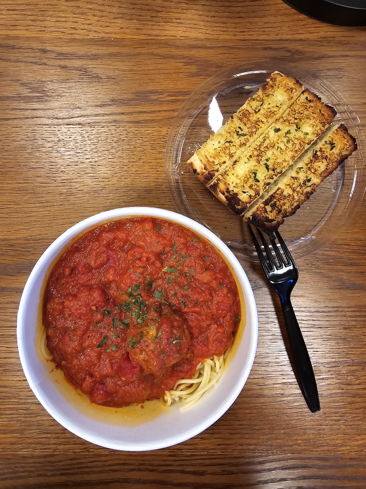 I have to say that it was probably some of the best Sketti I’ve ever had! The noodles were perfect Al dente, the meat sauce was tasty and full of meat, and the meatballs were extremely tasty as well!! The garlic bread was just about as good as you can get as well and was a perfect meat sauce spoon…