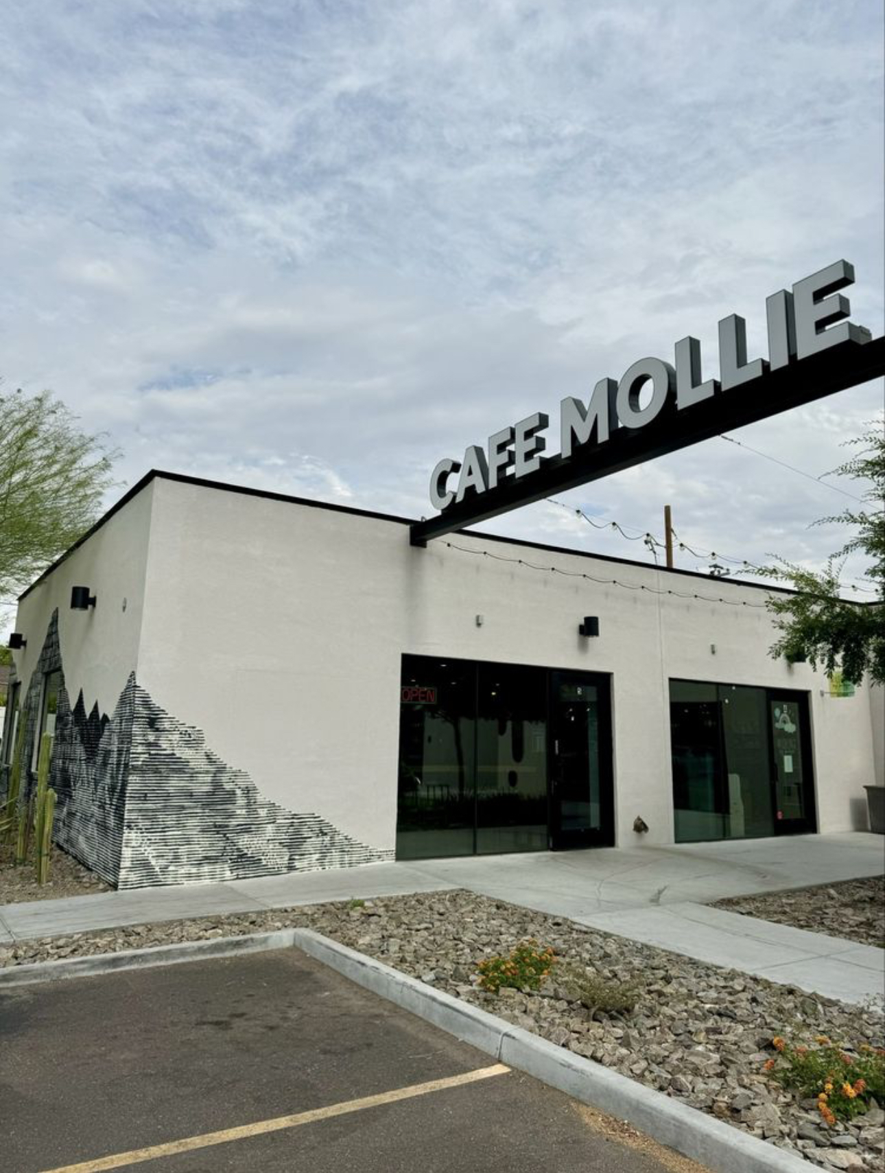 Tucked into Camelback East like a minimalist dreamscape with fairy lights and desert-modern charm, this place has main character energy written all over it. One look at the matte black bike racks, the clean white walls adorned with desert murals, and the cozy interior that whispers “write your memoir here,” and I was sold.