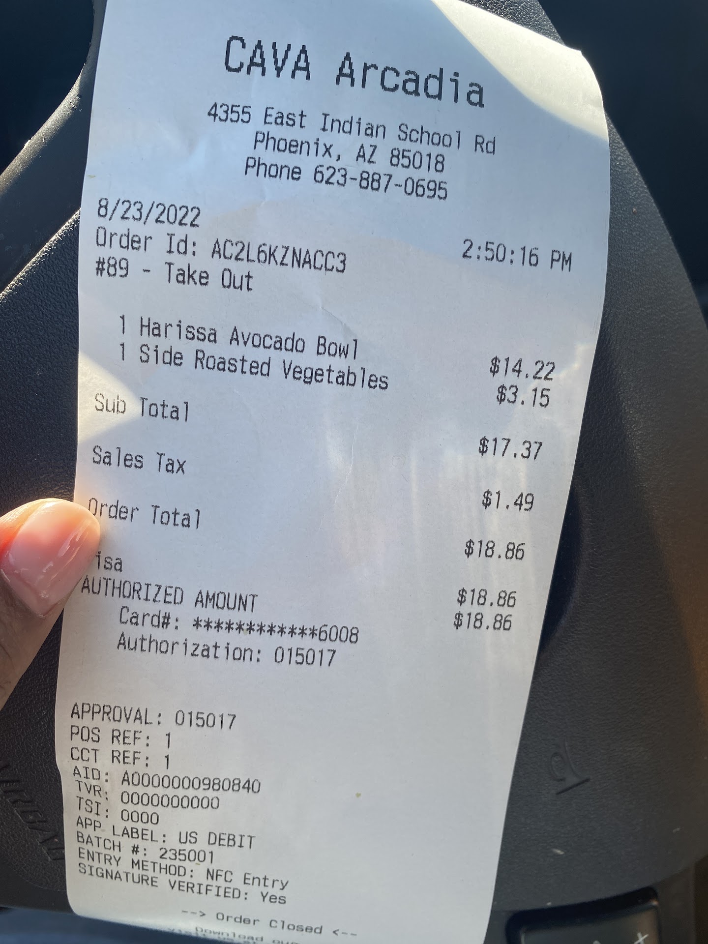 Read moreI’d love to give this location more stars because the food is excellent. It’s the unfriendly staff and lack of cleanliness of the place that makes me give this spot 2 stars. Today was the 2nd time visiting and my experience was the same as the first so I’m compelled to write this review. I decided to try this location again because my daughter really enjoyed her Cava experience while in San Antonio and it’s the one closest to where we live. We live in NE Mesa and made the drive today so she could get her Cava fix while home from college. We were not greeted upon entering. The staff behind the counter did not look happy to be there, seemed annoyed to have customers in the restaurant, and were simply order takers/order fulfillers. There was a couple ahead of us that clearly had never been to Cava before and the gal was not helpful to them. Seemed impatient and annoyed they were asking questions or taking longer to make decisions. The employee at the register was friendly but beyond that, no one else was warm or friendly. A majority of the tables in the restaurant were not clean & trash cans were full. Disappointed that my first visit wasn’t a fluke and it’s just how this location operates. Hopefully the other locations in AZ are better as the next time my daughter is craving Cava, we’ll be headed to one of those vs. this one on...