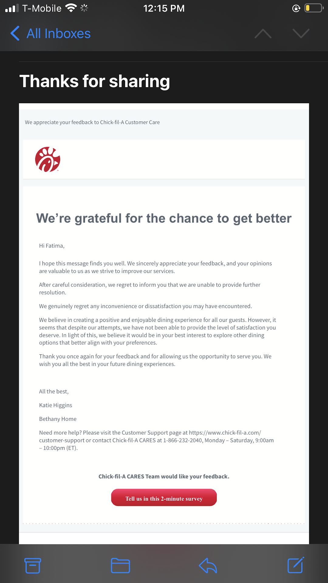 I’m a pretty big chick-fil-a fan and use to go to the metro center location till having 1 too many issues. On a side note if I lived where I use to I’d definitely be going to the first location I ever visited which is on 59th Ave and thunderbird, grade A every time all around! Anyways, I’ve visited this Bethany home location so many times I couldn’t tell you if I tried. I came here to leave a review to say, thank you Chris Hall for the rewards, although sadly 8 of 10 of them expired before I even seen them as I don’t get notifications about it just emails which I get hundreds of emails daily so it’s usually missed and I do have my notifications turned on so it would be nice if they sent me app notifications for these rewards so I could happily enjoy them rather than feeling sad for missing out. This review is based on all of my transactions at this location and not just a single visit. Most of the time I have no issues and the staff is always friendly. They’re typically crazy busy nearly every time I visit and can take up to 20mins to get through the line, but other times (probably when fully staffed, no call ins etc.) is under 10mins. I order ahead on the app 98% of the time as I like to know my order is placed 100% correctly each and every time. So every time there’s an issue, I make damn sure to address it, because I spend way too much to be getting the someone else’s food which I won’t eat, getting my order incorrect which again I won’t eat (I can’t stand pickles, and have gotten them a few times over a few years and always make sure to order without). I do wish this location had an inside area for ordering and eating as I don’t love the long drive thru wait, but it seems to be an even longer wait if I pickup at the window which isn’t the case at other locations. For them being an outdoor dining location the coupled times I have ate there were for breakfast and had no issues with pigeons that others review about. I try to park there and eat because it’s typically super fresh and hot making it BOMB, but I prefer to eat at home and by the time I get home in 20min it’s not the same.. the sandwiches are still great when I get home, but not the fries. I go here for breakfast more than anything and love their chicken minis, it’s such a shame how insanely much the price has increased and the 10ct use to be a better deal than the 4ct, now it’s the same, and it’s a shame how small the majority of the nuggets are especially compared to the breading. I have resorted to ordering an additional 5ct nugget to rectify this issue making it even more expensive. I wish they would bring the prices back down as I always sign up for rewards for places I frequent and feel the value was spot on 6yrs ago, and now overpriced which is to be expected since prices consistently increase everywhere sometimes up to once or twice a year, it’s crazy!! McDonald’s is just as expensive though, that’s ridiculous, and this is a much better option. From other reviews it seems that it’s a good thing I don’t order salads. I want to circle back to when I have issues here, prior to my last issue, I would call and they would put my down for what it was that was wrong for a free replacement up to 30days, they always first suggest for me to drive all the way back to them for a replacement which isn’t worth it as far as I live, but it’s always been fixed. Now this last time when they gave me someone else’s sandwich along with my friends sandwich I was once again left dinner-less. I called, but they were already closed so I went back the next morning and spoke to the manager and was told I had to call this number for the issue and was given a card with the number. I asked why I couldn’t be given one of those plastic cards for a free sandwich and was told they don’t always have them which I was unaware of as it’s what I’ve been given many times. I called although annoying after all this, it was handled well, and I’m a happy chick fil a...
