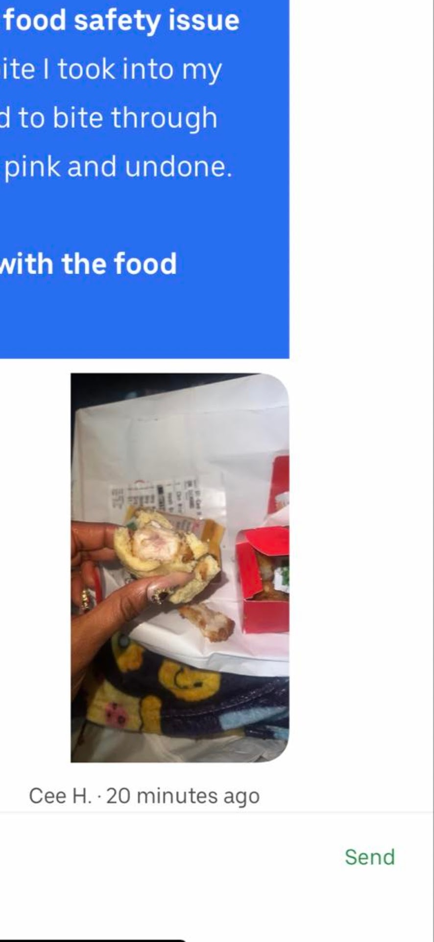Read moreI ordered via Uber Eats. I did receive my order fast and I was so excited to eat it. I ordered the breakfast chicken bites with hashbrowns. My first bite was into the chicken, and unfortunately, it was raw in the middle. I am so disappointed that I was not able to finish eating my meal. I was so grossed out and have had an upset stomach all day. I did file the issue with Uber Eats, and they refunded me. I also called the store directly and spoke with an employee. The employee was very kind, and he transferred me to their Care line. While I appreciate his kind demeanor, I think he shouldn't have said there wasn't anything he could do except transfer me to the Care line to report it. I think he could have offered an apology and a manager or even a complimentary meal. Basically, I am saying the customer service could have been better. I called the care line and spoke to Daisy. She listened, apologized, and said she would pass my experience on to the store manager. I use Uber Eats a lot, but this was my first time ordering from Chick FIL A. Unfortunately, this experience has ruined my confidence in the quality of food at this location. I am sure this isn't ordinary for them, and I am sorry I had...