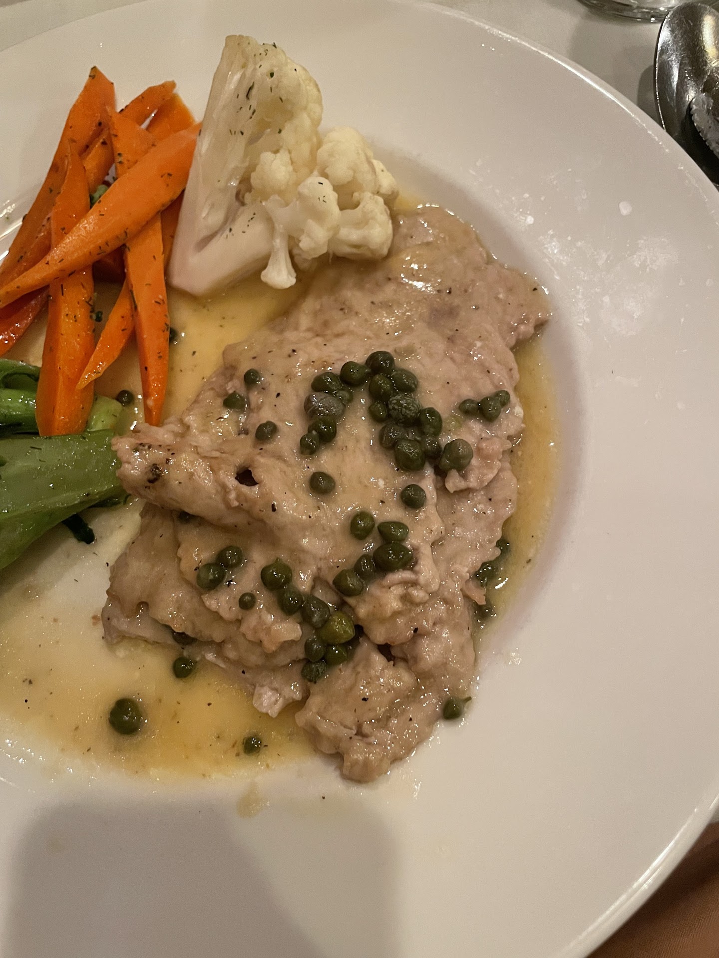 My wife enjoyed her chicken Florentine, though the broccoli, cauliflower and carrots were a bit crunchy for being steamed. A minor issue, really.