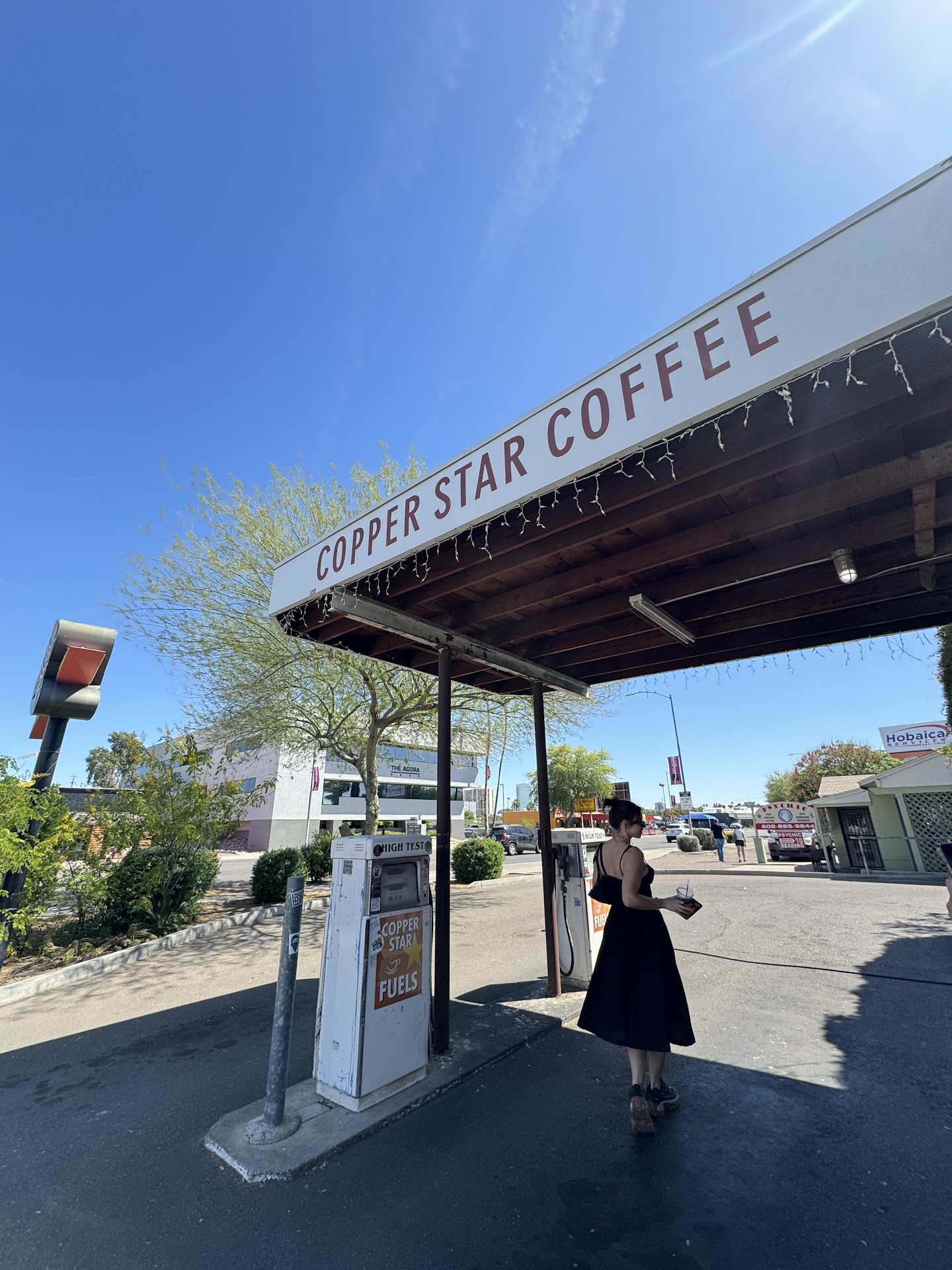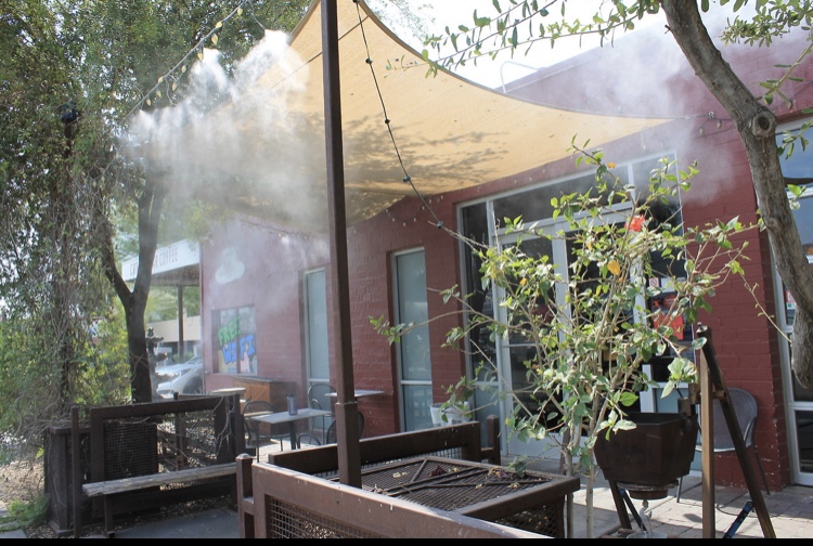 First of all, the atmosphere is amazing. It is an old gas station that was converted into a shop, they still have the old pumps next to the drive thru window! Inside the walls are decorated with local art, they sell it too! So extra points for supporting their community. The lighting is easy on the eyes, and there was plenty of seating available without a crowded feel. The outdoor seating was awesome because not only did it feature local art like a table made of bottles and a fountain, but also lots of plants adding a less urban feel. The big bonus was the misting fans, in 117 degree weather it allowed My dog and I relief while I enjoyed my latte.