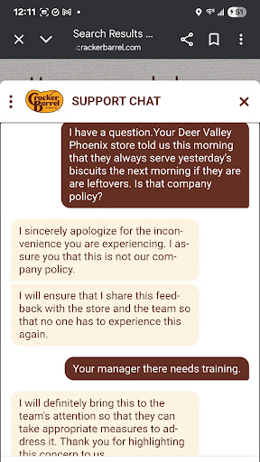 I'm a big fan of Cracker Barrel so I contacted the corporate offices via chat and asked for information on that policy. Totally bogus claim by the manager. I would like to include a screenshot of part of the chat. Unfortunately, the pictures and video link is not available from this review. It may be because this Cracker Barrel is not in my Maps timeline. Not sure.