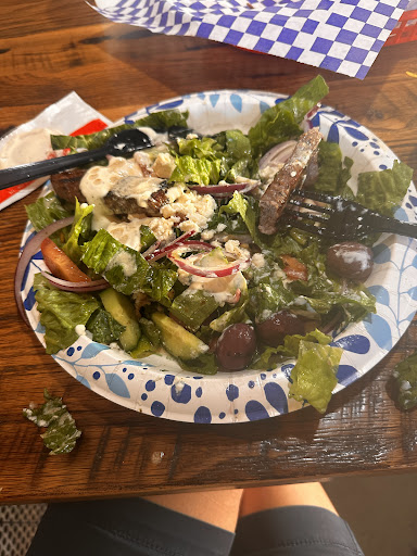 The menu offers a wide variety of Mediterranean favorites. You’ll find classics like gyros, Greek salads, falafel, hummus, dolmas (stuffed grape leaves), and pita with tzatziki. For something heartier, there are lamb and chicken platters served with rice and vegetables, as well as crispy fries and spanakopita (spinach pie). My companion and I ordered Greek salads, fries, and a gyro. The food arrived hot, fresh, and flavorful—the salads were crisp and refreshing, and the gyro was deliciously seasoned and wrapped perfectly in warm pita.