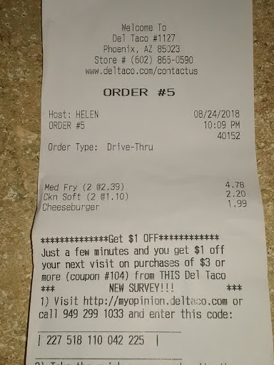 Read moreFirst time I ate at Del Taco was in Lake Havasu . I have the crunchy taco's. I could not believe how delicious the taco's were. They nothing like Taco Bell. Taco Bell taco had maybe 1/2 of spoon of meat . The lettuce and cheese did not even fill the taco shell. One of the taco's came unwrapped and all of the lettuce and cheese was all over the wrapper. So needless to say I will never go back to Taco Bell. So when I came back to Phoenix I found a Del Taco near my house. I was so happy because I wanted some more taco's. Well needless to say when I arrived home with my taco's from Del Taco I was so so disappointed because I had a deja vu. I thought I came back from Taco Bell instead of Del Taco. All the filling filled 1/2 the taco shell. So I'm guessing it depends on whose working the table knows how to make taco's. Because the employee did not compare to the employee in Lake Havasu. So I'm on the cusp of not going back...