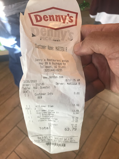 Read moreAt 1 AM there is nearly nothing to do in Tolleson Arizona. So I decided to hang out at this Denny's that I have been to many times. The atmosphere is very nice, the service is fine, and the food is usually mediocre (my experience with food in Arizona has been very underwhelming so you definitely can't expect much from a Denny's in Arizona). However, running into Sebastian and Jocelyn this morning has far exceeded my expectations, and they both showed me talent that I did not know existed in Denny's! First, the server (Sebastian) was very polite, friendly, professional, and efficient with handling all of my needs, banter, and fun conversations. Next, I asked the chef (Jocelyn), "How confident are you in cooking steak?" Jocelyn confidently answered with a mighty ten. So I took her challenge up and ordered the T-Bone Steak medium rare. To my surprise, the steak was not mediocre nor underwhelming. The seasoning and temperature of the steak was perfectly on point that it actually rivals steaks I have had from steakhouses. Jocelyn's cooking blew my mind and I was beyond impressed. I have never ate such greatly cooked food from a Denny's before where the cooking was perfect right down to every detail of the dish. Because of both Sebastian and Jocelyn, I had a wonderful midnight hour. This is a visit from Denny's I will...