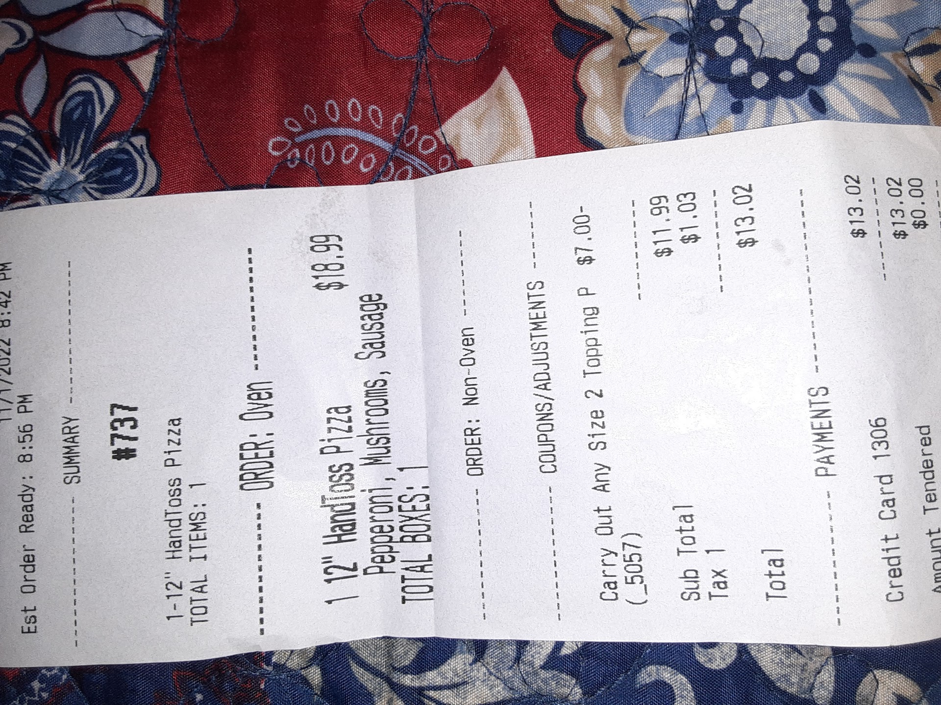 At this point I gave up and ordered from Barro's instead (better pizza... more on that later). At ~9:30pm the Barro's order arrived, and 20 minutes later so did the Domino's order.