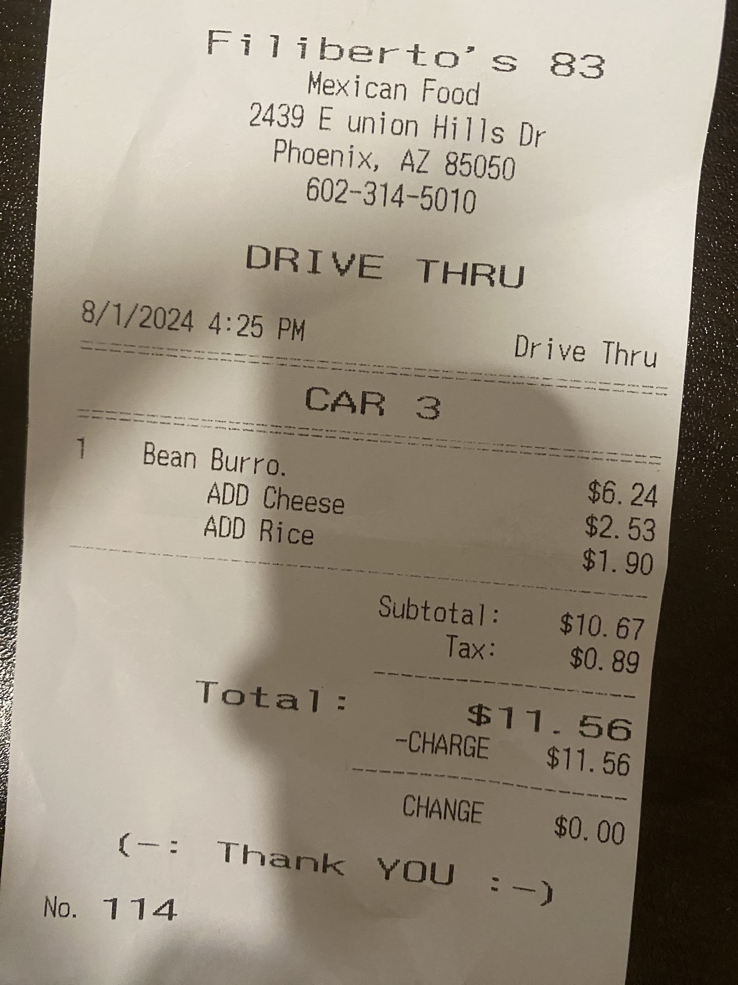 Read moreWent there last night and they tried to charge me $19+ for two bean and cheese burritos. Filiberto’s website says a bean and cheese burrito is $5.43. This location claims that it is only for beans and tortilla, and that they up charge for cheese to be added. Which I am assuming is a $2.50-$3 up charge. Which is not accurate with the Filiberto’s website. Same issue with most location. No one is on the same page with prices. Best time to go is on Wednesday’s when they have their bean and cheese burrito on special. (They still up charge for cheese, but it’s a lot cheaper) One thing I really like from the location is the red sauce. It is so good, spicy, and flavorful compared to other location. All in all, $19+ for two tortillas, beans, and cheese is straight up outrageous. I just left. Figure it out...