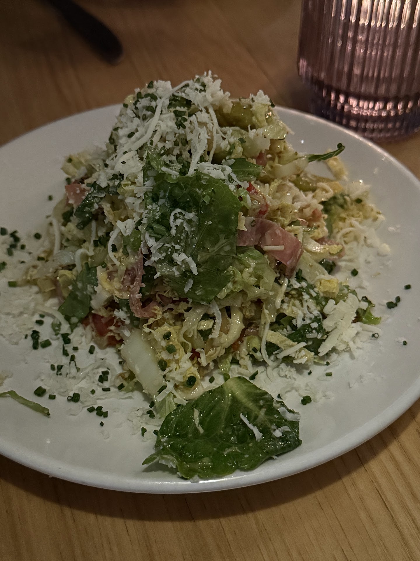 Salad was good, it had some ham and fine chopped veggie, but vinegar was too strong and sauce is too salty. Even I like to taste sour/citrus.