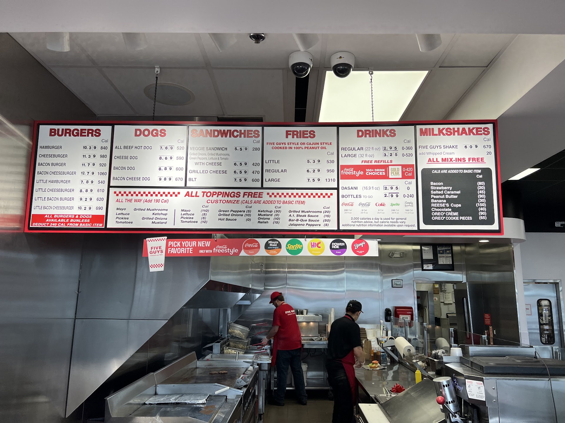 Read moreI started out giving Five Guys three stars because I was bummed by the prices. (The reason I'm giving it four is explained at the end of this review.) We ended up paying $21 for one cheeseburger with fries, one veggie sandwich, and one soft drink, all of which was equal to but no better than what we get at another burger place. They probably get away with it because of their generosity with fries, which they pour into your bag on top of everything else, but I don't consider that a big plus myself. I don't like digging down through fries to get to the other items. I know this is just their unique gimmick and probably helps their reputation. The employees are friendly, service is great, atmosphere is nice, but I just don't see myself paying that much for what we got in the future. Another gimmick is the peanuts to which you can help yourself while waiting for your order, which is nice. Okay, I'm going to change it to four stars so that anyone who has never been there won't be discouraged and can experience it...