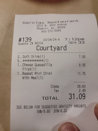 Ā Ā Ā Read moreWe are from out of town and went to Garcia's for dinner tonight (Sunday) because it was recommended by a couple friends. When we got there, it was about 7:30 pm and if we didn't have our GPS, we never would have found it because the sign is very poorly lit.