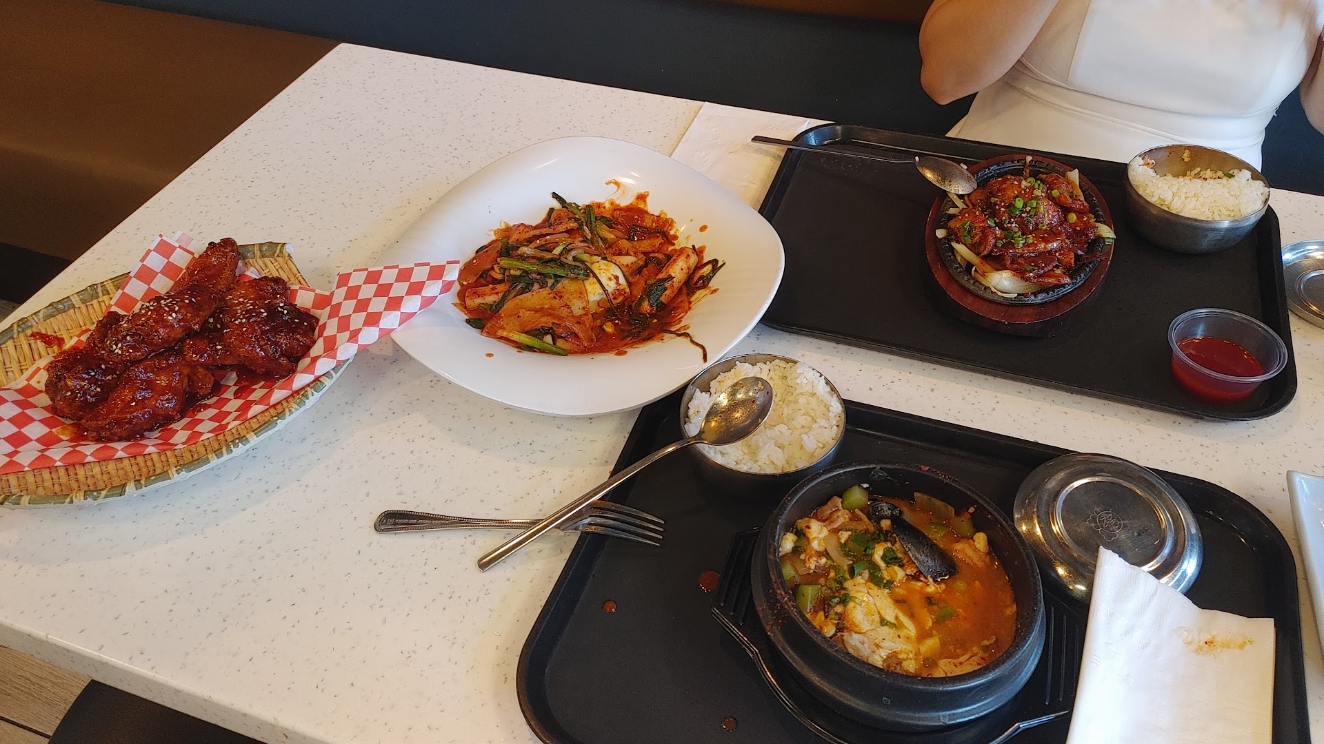 We also ordered Tteokbokki, spicy pork belly, and the sweet and spicy wings, and about 3/4 of the way through our meal we thought about it and said "Not one thing has just been 'okay' or mediocre. Literally all four dishes are delicious." The teokbokki is perfect, just the right level of spiciness and comes with a hard boiled egg. The sweet and spicy wings were crunchy and slathered in sauce on the outside, but hot, tender, and juicy inside. All four dishes came out PIPING hot, which is the best way to eat soon tofu and wings especially. Be forewarned, however, I tried ONE dab of the extra spicy wings and they are brutal, and I can occasionally stomach the 2X Hot Bul Dak ramen.