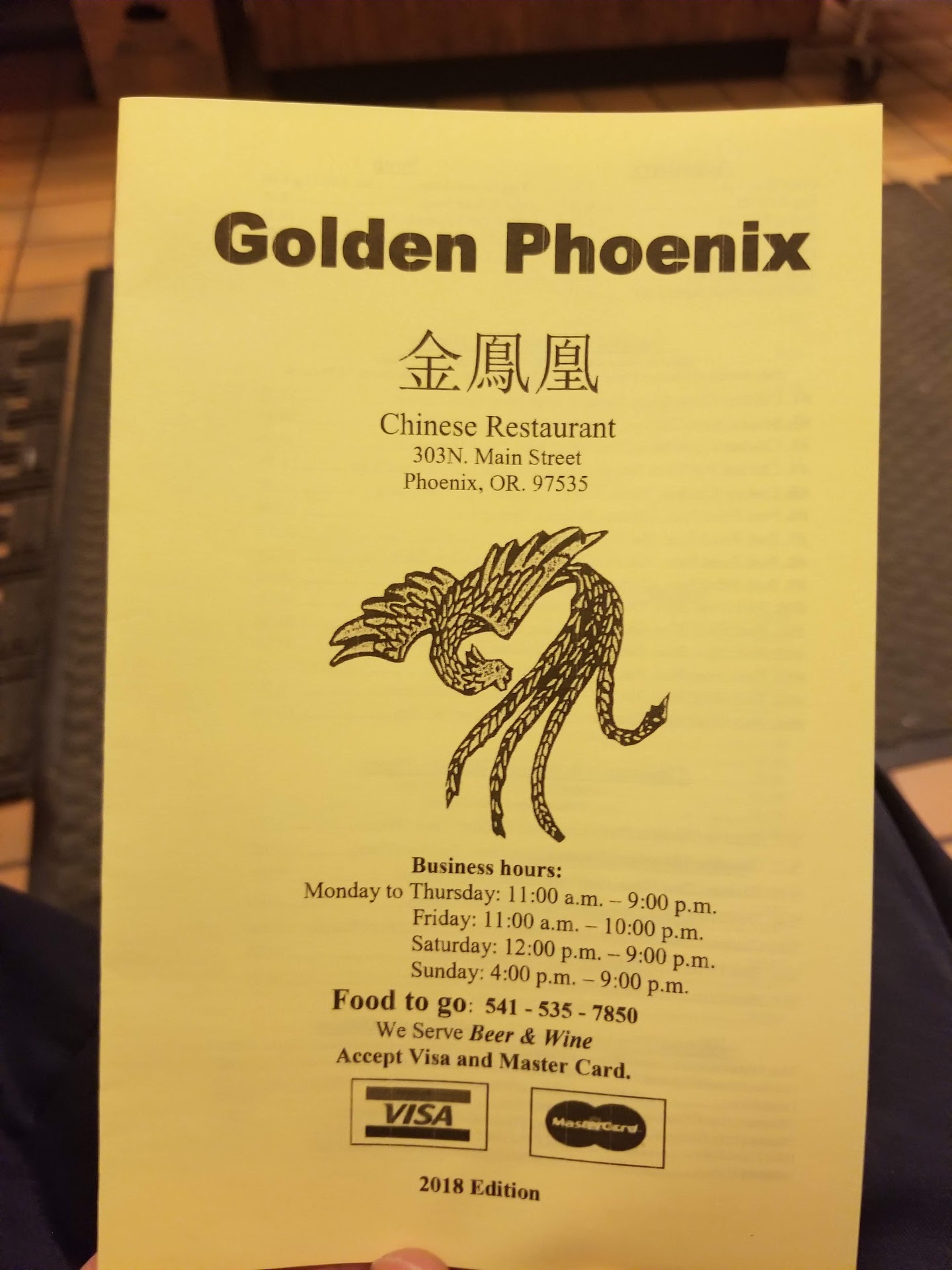 I do not know what happened to Chinese food, at least in Oregon. Back in NY where I grew up, our father would bring home Chinese food once a week. Where did barbecued spareribs disappear to? What happened to reliable chicken chow mein? When I moved to Chicago I had the most incredible sweet n' sour pork. Now, no where to be found. The Golden Phoenix has ample parking. I give it one of the two stars for that. The setting inside is comparable to a federal institution; it is dark, unattractive, gloomy to be exact. The place does not smell good. We ordered cashew chicken chow mein, egg foo yong, sweet n' sour chicken and broccoli in oyster sauce. The only employee in the restaurant is possibly the owner and the cook. When we walked in, she was in the back cooking our takeout. Earlier, she had not been very nice when we called. The "Food" is hard to describe. Let me say that the egg foo yong might be better called egg poo young. The smell in our car had me close to nausea and retching. Unedible. It did not look like nor taste like what I have had at least 50 times in my life before. The cashews in the cashew chicken dish were old and almost soggy almonds--not edible and tossed. The sweet n' sour chicken was chicken in a fried batter that you dipped into the chef's sweet n' sour sauce. It was edible if you were really hungry. The only decent dish was the broccoli in oyster sauce. But compared to other restaurants serving snow peas in lobster sauce, it was at most on a scale of 0-10 a 5 or 6 if I were generous.