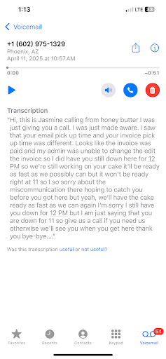 Were you waiting to make a cake at 7am or on vacation? It’s clear it’s the latter, as I received no call back. No grace that I showed them when my son’s cake wasn’t ready on time (see screenshot). Just a lengthy online comment.