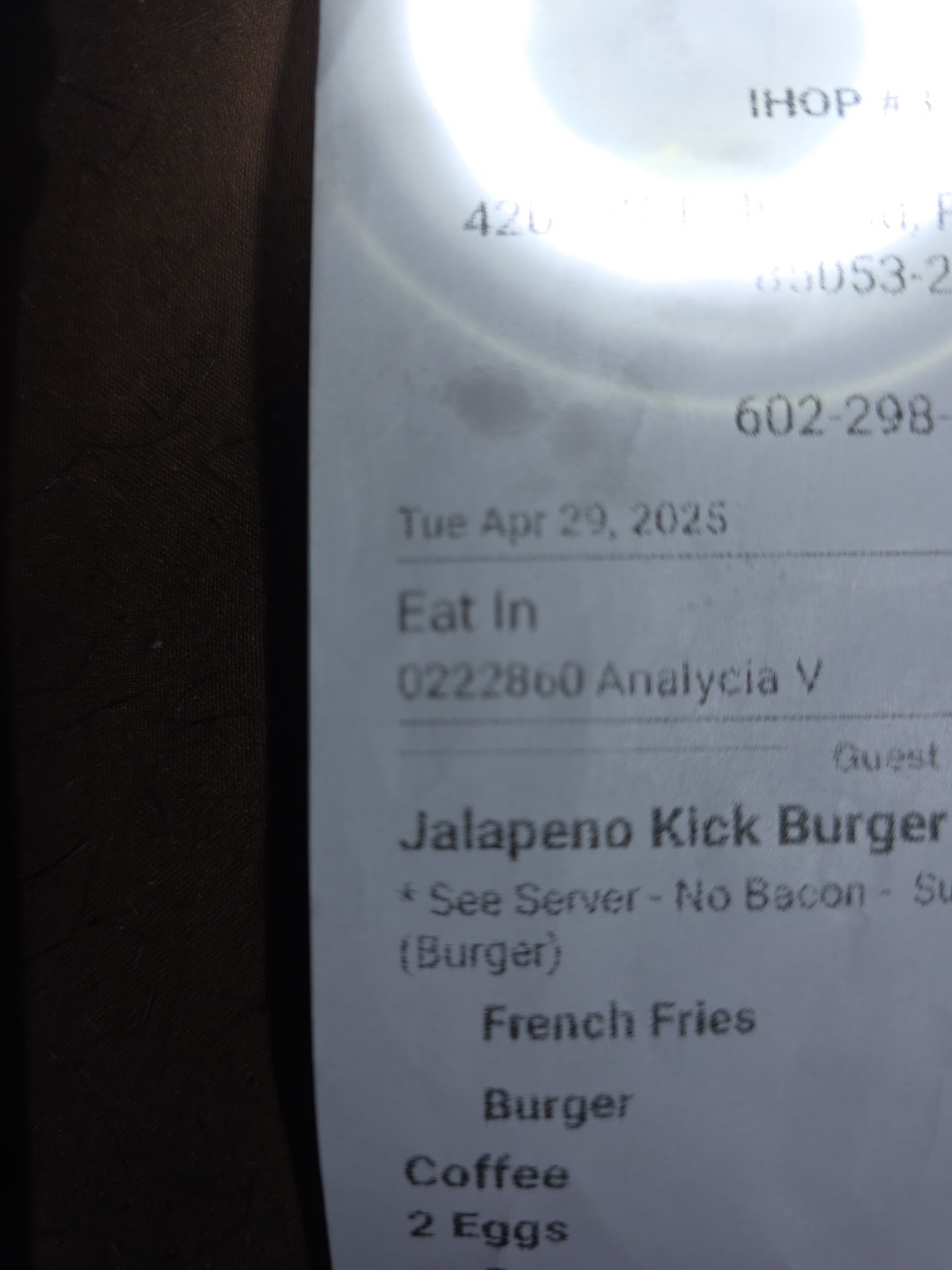 Read moreEveryone in a customer service roll should be polite and be hospitable. [Even if they have to fake it] When coming in to ihop, we were approached with great manners and sat down immediately. For whatever reason we were switched to a different person after our drinks were taken. When asked for our order, unfortunately this is where it turned into a not so much pleasant experience. Cook or waitress Didn't get my order correct, it took no joke 5 min explaining how I didn't want canned Jalapeños but I'll take Serrano peppers. Didn't ask about our drinks to be refilled. The place only had 4 tables being served. When young lady was placing bill on table she put it on corner and walked away without a word, we attempted to talk to her and she walked away. We were trying to ask where we pay. No reply. No matter what when bringing a bill, you should say thank you or do you need anything else. Meanwhile another waitress cleared our plates. We wanted dessert but was never asked if we wanted anything else, after all that we said no obviously she don't want to serve us, so we will leave. Management please try to have them do the basics we would have ordered desert and another drink besides coffee but maybe she's new to service but I'm sure you train them...