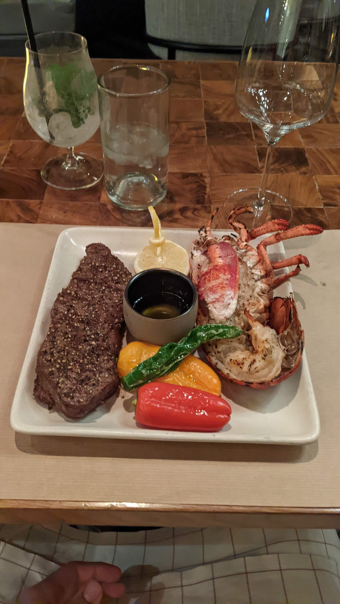 The inside is extremely well decorated, modern, spacious and beautiful. Hostess was super friendly and sat us up against the floor to ceiling glass wall overlooking the city from up on Camelback Mountain, the view was phenomenal, city lights as far as you can see. See pics. All the tables are set beautifully, candle, Pinot wine glasses, full settings. Nice! We grabbed a Titoâs and soda along with a Beam and Seven, great start and went nicely with unlimited homemade fresh warm salted rolls with muffin like tops and homemade butter. Mmmmm!