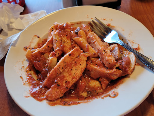 Small parking lot with small spaces. No one to greet you when you arrive, so I had no clue what to do. After standing awkwardly at the door without being greeted at all, I walked to the back of the restaurant. Someone stumbled upon me and seemed surprised to see me. I asked to be seated and was told I needed to order at the counter. Cafeteria-style service - you order and pay, get your own drink, and then choose your own seat. I ordered the Patras pasta with a side salad and a beer on the menu. I was told they didn't have the beer I ordered or blue cheese dressing. I asked for a Moretti beer (received) and a water glass I didn't receive. I went back to the counter to get a water glass but never could drink from it because it had lipstick on the outside and food stuck to the inside.