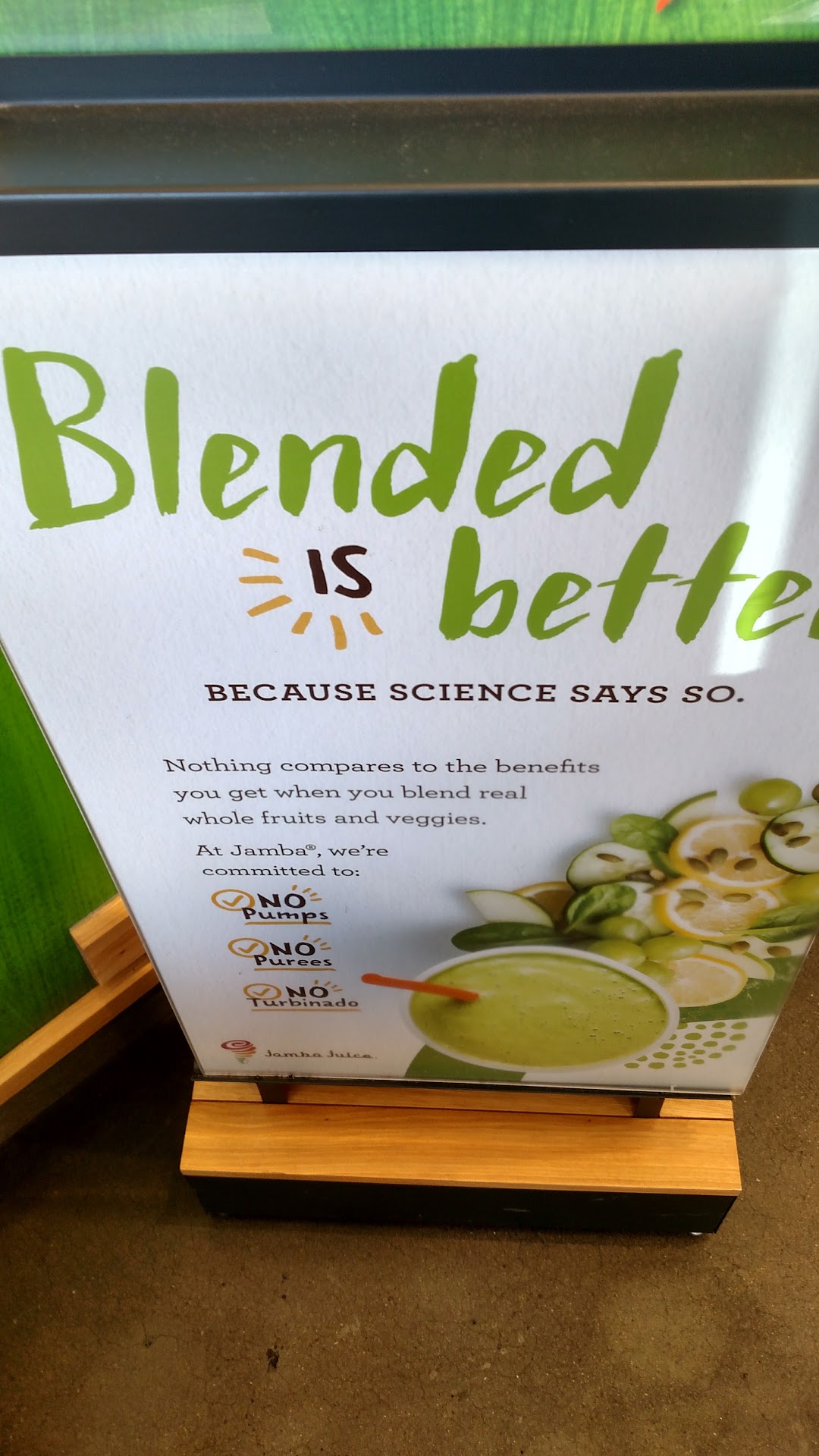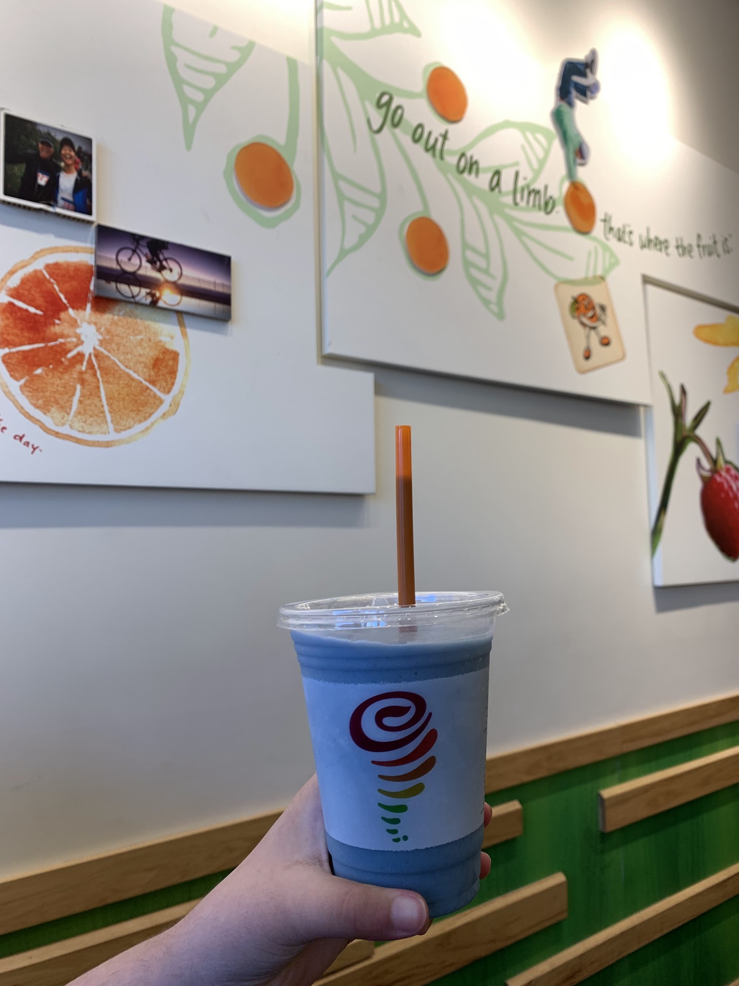 Once found though, & entered, it's great! Smells great + very bright inside. You walk to the back to order, then pick up your drinks at the counter, up front. There's two sitting tables inside, & maybe two more, outside?...but like usually at Jamba Juice, take your drinks & skeddadle!