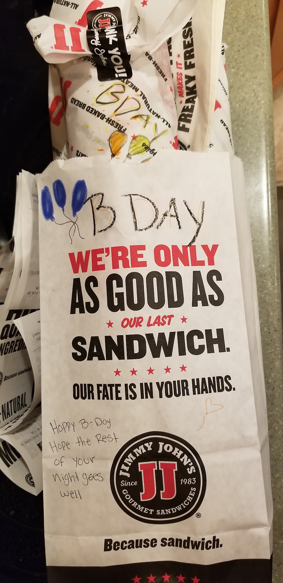 Read moreI thought their slogan was "freaky fast delivery." They weren't on my most recent visit. I ordered Jimmy John's because they are supposed to be fast and I wanted to have something delivered to my house before I went to work... It took them over 30 mins and almost made me late to work. I was not impressed by their promptness. I could've picked up the sandwich myself if this was going to happen. This is not the first time I've noticed this either. Other Jimmy John's aren't as fast anymore. I used to order from here regularly when I was in college and they were always 10 mins or less. Step up...