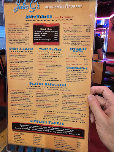 Read moreI came to your restaurant on Saturday June 10th at about 8:20 in the evening for my birthday dinner. I had actually spent the day surfing the web I'm looking at different Mexican restaurants and menus to decide where I wanted to spend my birthday I ended up Julio G's because I've eaten there before and I like their food. When we arrived we were seated right away and within seconds a waitress came to our table and got our drinks very quickly. She was a talller thin long hair girl. She gave us a few minutes to look at the menu and it took us a few minutes to decide we ordered our food and within 5 minutes our food was at the table I was very impressed. Then it all started she delivered our food and I said that was fast she said were closing in 30 minutes ma'am. I thought to myself I guess we better hurry she's looking to get out of here. While we were sitting there eating our dinner several other tables were seated she stormed back and forth in the restaurant upset the people were being seated still. it made me feel very uncomfortable. We tried to race to eat our food so that we could get out and they could close but at the same time all the people that came in within 20 minutes of us being there we're still going to be there after 9 to enjoy their meal. After the check was brought to us and we paid our bill we got up and started heading towards the door we could see another family coming in mother father and children. We could hear the waitress standing in the middle of the restaurant mumbling and was quite upset that somebody else was coming in I guess she really really wanted to go home. Being that it was my birthday and it wasn't a very happy day for me anyway because I have a child who is dying of cancer I decided I would just let it go and say oh well it was just another birthday I'm not going to let her ruin it. We were parked directly in front of the restaurant we could see in the window as the family with the children were walking in she was waving her arms and talking like crazy we knew she was very upset unfortunately I find this to be very unprofessional these people are tipping you and are coming in to enjoy a meal. I just thought I would let you know that even though the food was delicious what little time I got to spend outside of my home not watching over my son was not worth it.... I will learn next time that if we want to go out to eat we better be there at least an hour prior to closing so that the workers do not...