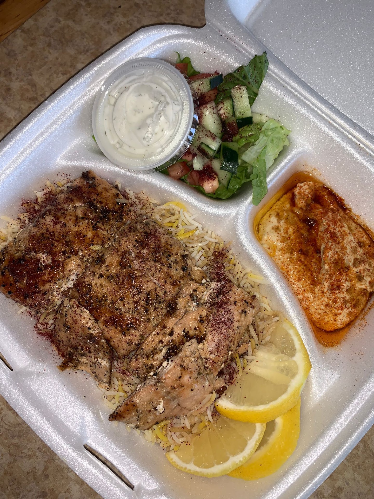 Read moreFood is good. My daughter and I previously had the gyros (first time trying them) and we loved them. I noticed the salmon was not available to order online so we went in to order at the counter (first time). A couple of people were seated/waiting and we were informed that there were people in front of me so the wait for salmon is 20-23 minutes... Okay, no problem we had no where to be at the time. Sure enough people came in to pick up online orders as well as counter orders and were given food first. At this point its still no biggie, I'm expecting the salmon to just require special prep and I'm glad about the intentionality. About 30 minutes pass. Before our food was ready, we noticed how she handed everyone else their food in their hand over the counter and told them to have a good day and thanks for coming in. When our food was ready she called for us and just looked at us then walked away while pointing and saying, "it's right there". Very different from how other customers were handled. Food was good but when paired with service, it's a no for me. I'm not paying for good food that comes with treatment towards anyone as if they're beneath them. Wish them well but I won't be...