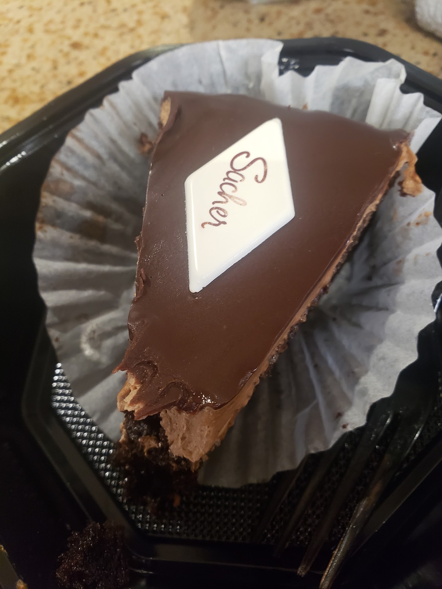 I highly recommend this place if you want a nice meal that is not airport cheap food or fast food. First of all, I love this French chain with amazing gourmet food and have eaten at the Houston location many times. This is excellent cuisine, not food. You cannot reasonably complain about their prices if you want cheap food. This is not cheap food. If you want fast food pay for it by eating at the McDonalds next to La Madeleine,would be my recommendation, as this is French food and well worth the price. I had the smoked ham and swiss with garlic cream sauce sandwich (Croque Monsieur) to which I added blackberry jam to (making it similar to a Monte Crisco sandwhich) and enjoyed it immensely. The staff were quick and pleasant with my order and the food was delicious. I had their little Sacher Torte 3 layer cocolate cake, soaked in vanilla and with raspberry jam inside and topped with chocolate mousse and ganache and the famous candy emblem, which you can see in my photos and ooh la la! Look at my photo for the serious thickness and weight to that cake! Amazing! The old adage, you get what you pay for, rings true here. I chose to sit down and have a beautiful experience and not inhale a burger for a change. Yes, it's an airport restaurant, but not this food. I felt very happy to have indulged in French food before the final leg of my long, tedious, holiday journey and was glad to have a tummy full of yum when I boarded, so I didn't have to pay for a 15 dollar sandwhich and bag of chips on board. Indulge is the word for French cuisine. This...