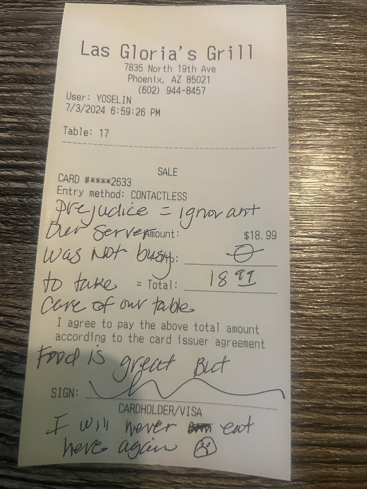 Horrible!!!!!!!!! We didn't even have a waitress, The manager asked the dishwasher to wait our tables. She didn't speak any English, never made eye contact with us, and repeated our order 4 times because she never wrote it down. We received our food and it was NOT worth the price at all!!!! Disgusting !!!! I was on my lunch break and tried to eat some of it because I was so hungry but I couldn't stomach it. I ordered the shrimp enchiladas, which had chiles and salsa inside them. It was horrible. We asked for more chips and salsa because I wasn't going to eat the food. The 2nd bowl of salsa didnt even taste like the 1st one, it was spoiled. I just walked up to the manager and asked if I could pay, I explained everything and she goes, " Well I can discount your meal by $9.00. I told her I would never come back and I am giving them a bad review !" She asked what was wrong with the food, I explained and she goes, " Well you should of told the waitress you didn't want salsa inside the enchiladas." I explained that the "waitress" was not a waitress, which the Manager clarified she wasn't. I told her it was my first time at the location and how was I suppose to know if the menu didn't give a detailed description . I just paid and...