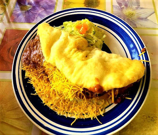 We came here today with my boyfriend and I, revisiting after 2 years. Back then I thought the place was ok, and was fond of the open face fry bread with red chile. This time, he got that, and I got what is known as the Burrito Grande. Inside, what is supposed to be carne asada with beans and cheese is actually boiled, poor quality meat with beans and cheese and what seems to be ground beef (not a lot, but just enough to add grittiness). Was there an excess of ground beef, and rather than wasting it, the kitchen decided to incorporate it into a dish it has no place being in? Seems like it. When I asked the cashier what is in the burrito, ground beef was not mentioned. After eating only half of my burrito, I spat out 5 large connective tissues. So then there's gritty ground beef and what is supposed to be carne asada, but is in fact poorly butchered, poorly processed, and poorly cooked, low quality meat, the cheapest cheese known to man, and some pretty decent tasting beans wrapped in a giant tortilla. But does it stop there? No. The giant burrito came topped with more cheap cheese, and enough chopped tomatoes and lettuce on top to feed a horse to death (if horses ate lettuce and tomatoes). These unfitting toppings were also never mentioned by the cashier, but that's just an overlook on his part. My first thought when starting my meal was "If someone missed the way Taco Bell used to taste 20 years ago, they just need to go to this place and pay triple for what they would have there", but after getting through less than half of the food, I understood that the problem is that this place started off with something really simple and something they made well: the green/red chile and fry-bread, but then, without having neither the technical skill nor the desire or ability to inject enough money into quality products, they decided to expand their menu, and serve incompetently cooked, low quality food. They need to at the very least change certain cooking and food prep techniques, and pay closer attention to what the important things in food are (freshness, appropriate textures, balanced tastes and portions, bold flavours). I hope the owner reads this, takes my critique into consideration, and makes changes and do better in the near future, because it is not my intention to slam someone unfairly, and especially not to drag a small business...