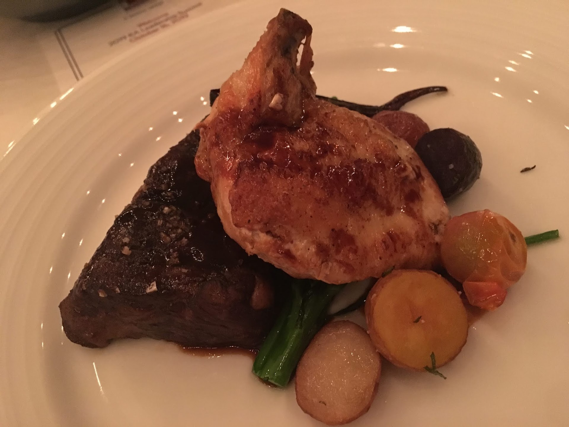 We started with the Local Corn Tortilla Chips with Guacamole and Roasted Tomato Salsa. It's avocados from the Southwest--hard to go wrong here, just smash and serve, right? The roasted salsa was delicious and flavorful, with a slight bite. We were then served a Mixed Greens Salad, a medley of local greens, heirloom carrots, blue cheese, pecans, drizzled with a prickly pear vinaigrette. It was a little on the small side, but done very well--the vinaigrette was a perfect balance of sweet and tart. The entree was a Zabuton Steak and Pasilla Roasted Chicken, served with roasted potatoes, and seasonal mixed vegetables. This was a little but of a letdown only because it was heavy on the meat. I would have liked a smaller steak and more seasonal vegetables. However, they were cooked well despite having to crank out 50 of them. We finished the meal with the Eclairs, Cream Puffs, and Pecan Tarts. Those were all a disappointment because miniaturizing dessert typically yeild an off-balance ratio of sweets to pastries (i.e., filling to crust). None of them were worth the calories.