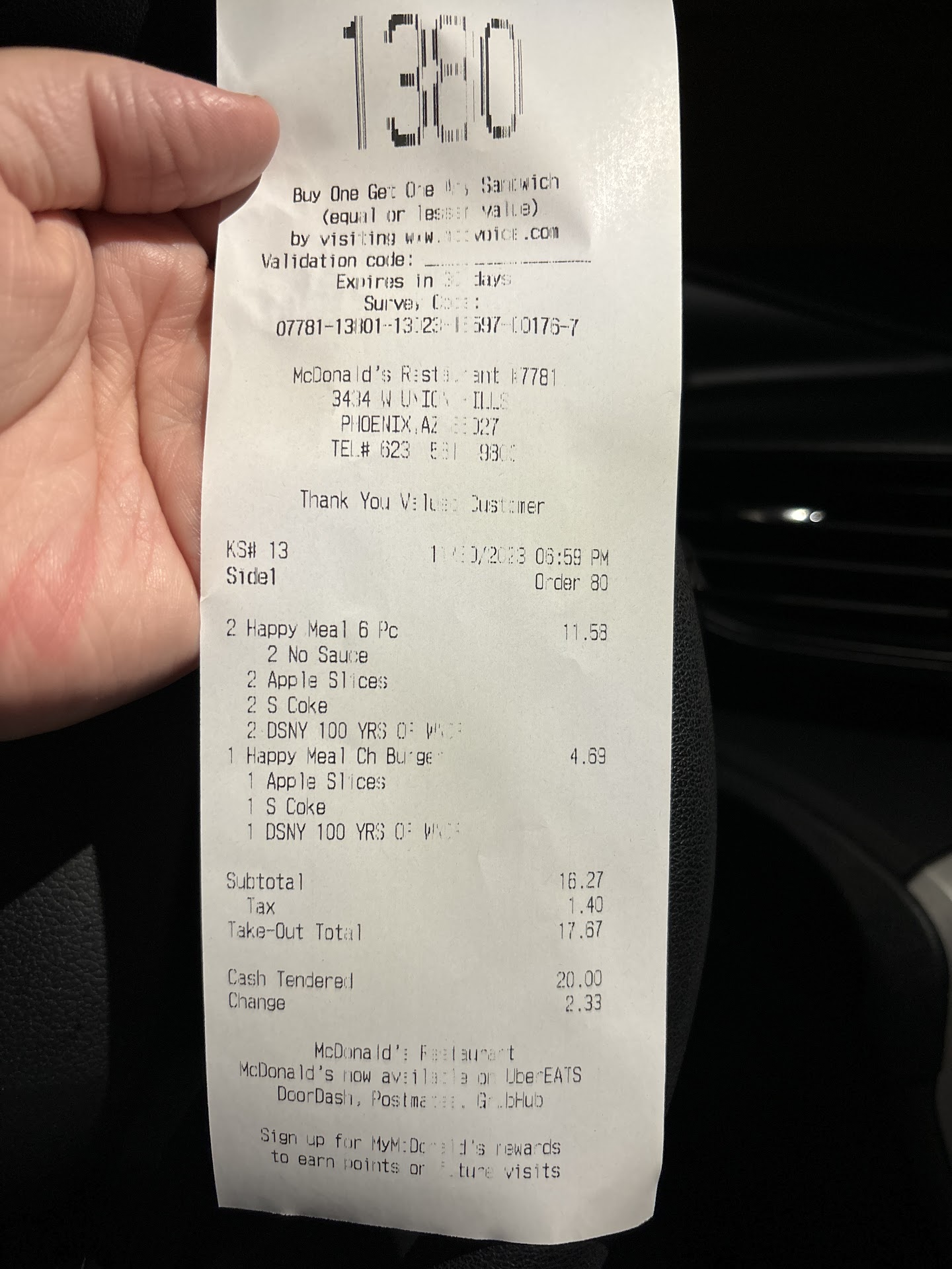 Read moreI paid for the wrong order, the girl at drive thru only said a price so I didn't realize until I looked at the receipt once I got to the second window so I told the nice guy at pick up window what had happened and handed his receipt and change so he proceeded to tell the supervisor who was gone for several minutes came back with the exact same change and told him to give it to me. poor guy said I'm just doing what he asked me to, super confused myself I told him my issue was I only got two happy meals that I had not pay for and I got a free happy meal with my points. Therefore I got a total of three happy meals but only had to pay for two. I had to pay around $19 for two happy meals and the supervisor thought that that was average payment I guess but I told him my issue was I should have paid at least six dollars less so then he goes away again the supervisor and comes back with an extra dollar and some change and a receipt that wasn't mine but three made up happy meal orders I had told him before that I used my points that are now gone, 6000 of them for the free happy meal but obviously he didn't hear me or didn't care to resolve it correctly and make me look like the crazy lady who wanted a dollar more when indeed I should have gotten at least 7 back unfortunately I just decided to just leave because I already held up the line for a good 10 minutes. Super ridiculous. Would not recommend past 6 o'clock. Why have a points system if you won't honor them because your too lazy to look up the last order I'm assuming the guy behind me or ahead of me got three whole adult meals and got lucky and paid my two happy price, just mind blowing. Should have paid 12 max and paid 18....