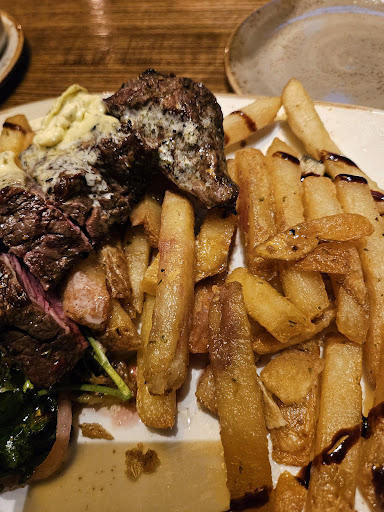 The salad was overdressed and oddly portioned—just a few arugula leaves piled on top of mostly tomatoes and pickled onions. I will say the steak was the one redeeming part of the meal—it was cooked well and tasted good.
