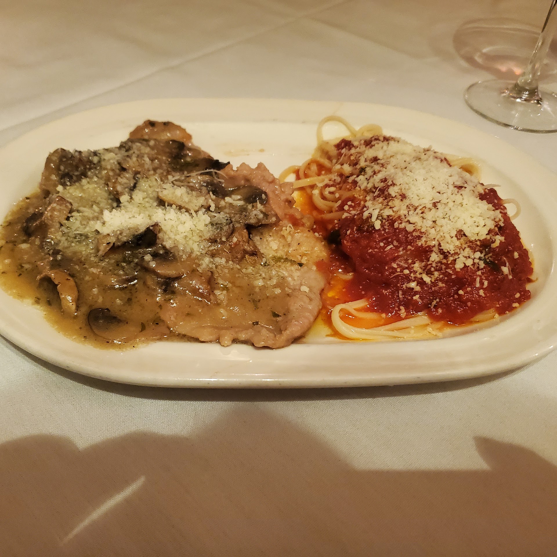 Entrees arrived and we enjoyed them fully. Wife had Linguine in Clam sauce which she loved. Her only complaint was there were no open clams on the plate with the serving but she stated there were clams aplenty in the dish and the taste was superb. She was very pleased with the taste and serving size (she brought about 1/3 home). I had Veal Marsala which was served with a small side of tomato sauce pasta. The veal was pounded thin and cooked perfectly- it was easy to cut, flavorful, sauce was perfect and mushrooms were also perfect. The pasta side was an excellent complementary dish to the veal and was also perfectly cooked. I finished my plate eagerly and sucked up some sauce with some of the bread at the end. We both were extremely pleased with these outstanding entrees.