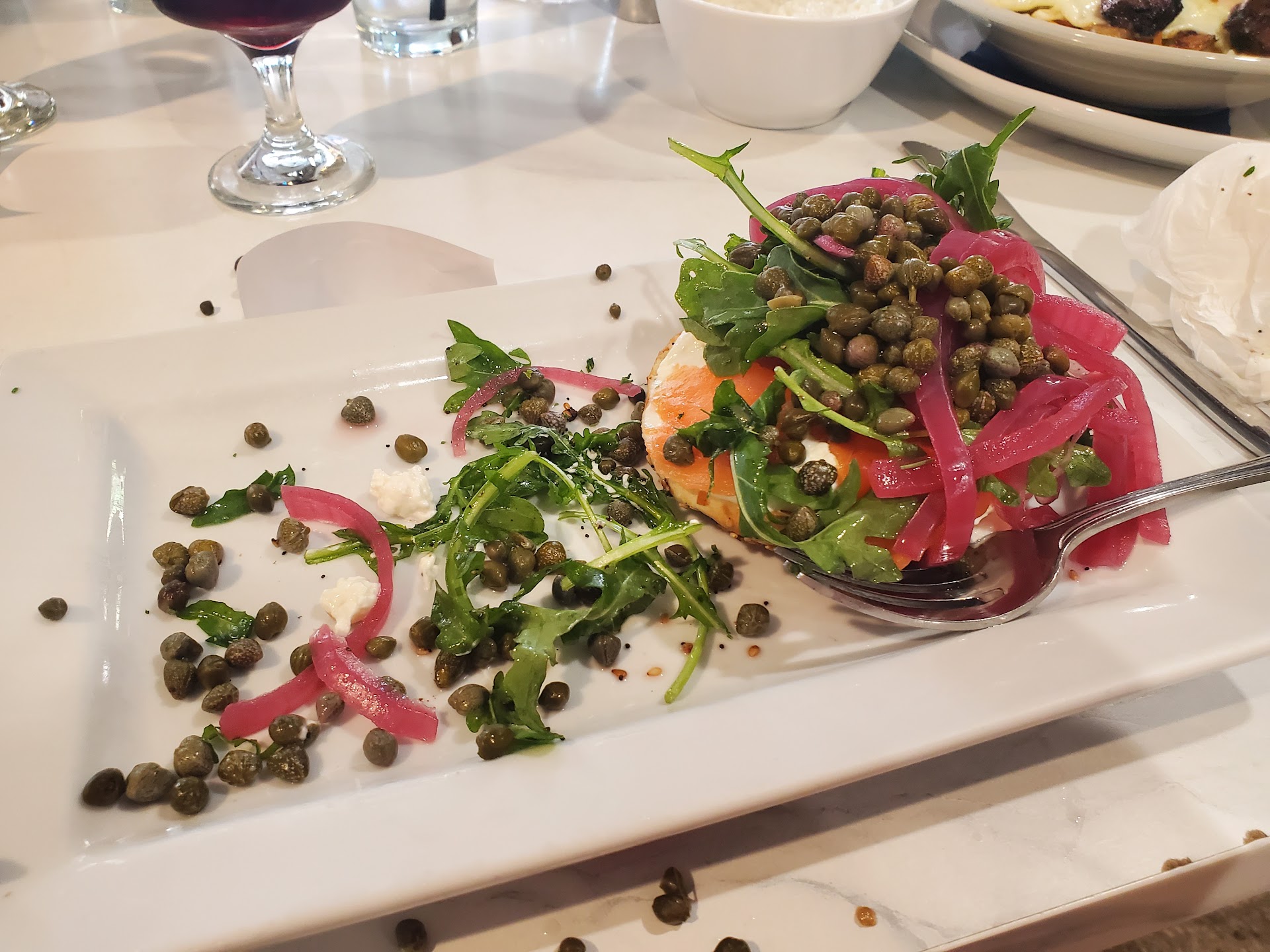 I was horrified with the abomination they brought out. The toppings were stacked high. Too high. One third of it was just capers. Endless, endless capers.