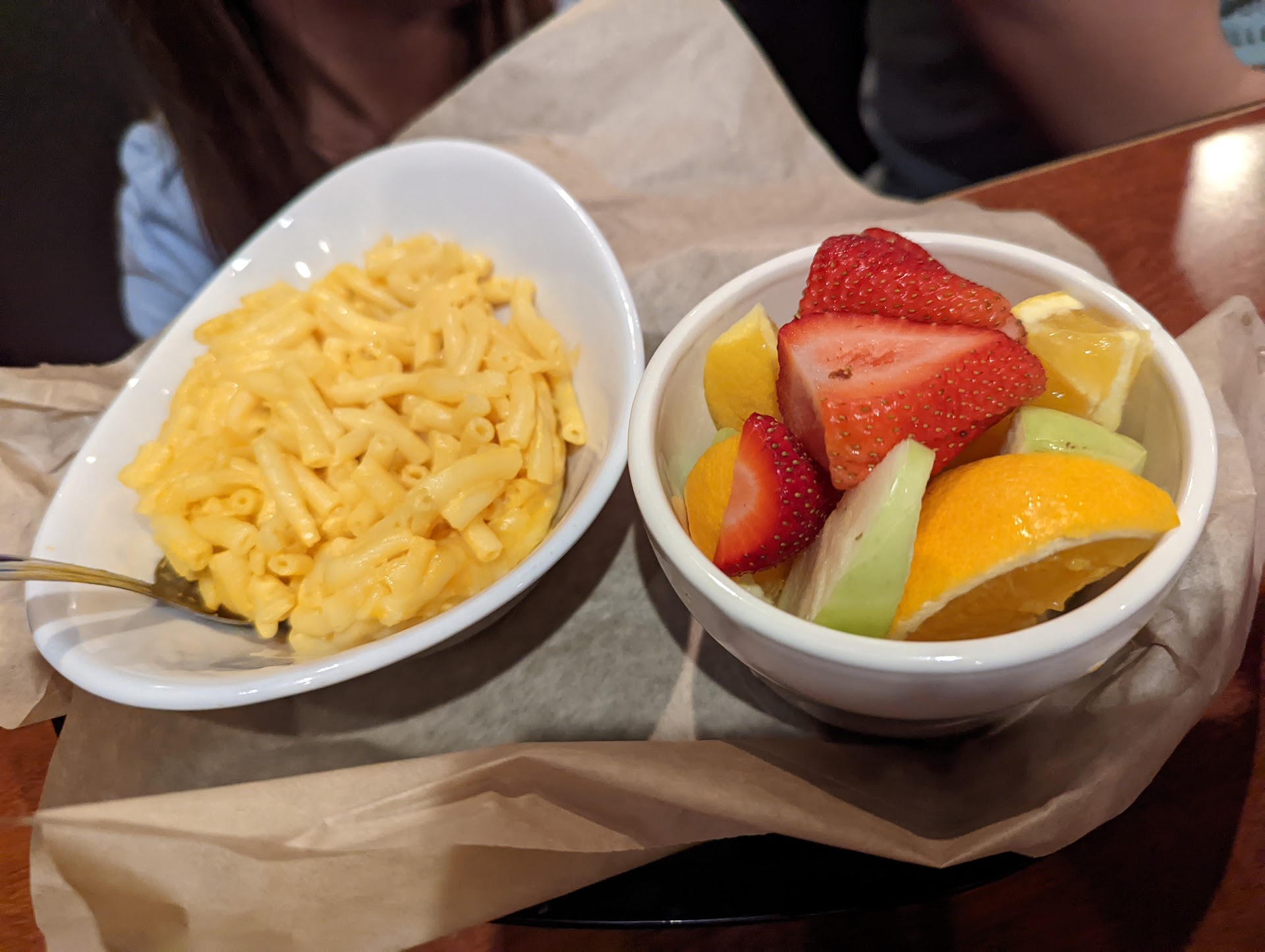 There are a ton of wing sauce options and the best day to go is Tuesday for the 85¢ wings with drink purchase. There are about 5 or 6 kids meal main entree options which come with a side and drink for $6. My 2 year old lives off potatoes so she enjoyed a side of french fries (they also have a basket of fries that's bigger). Fries are like thicker shoe string style and come salt and peppered with a side of ketchup. I ordered a pizza as it's the only real vegetarian entree option. It's VERY cheesy so be sure to take your Lactaid beforehand, and toppings range from $1.50-3 extra depending on pizza size. We did not order any beers to make a judgement on them.