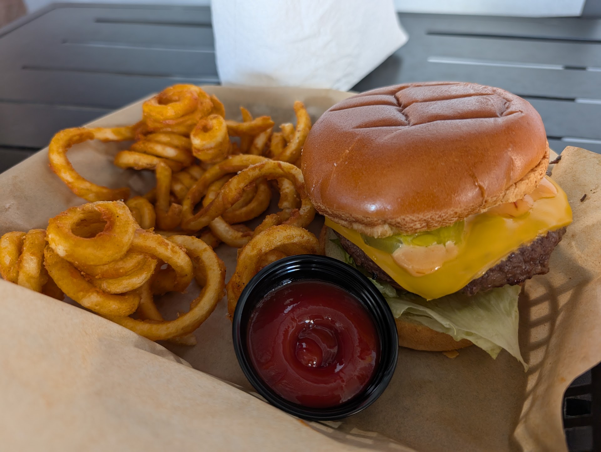 Burger and Fries: The burger, as seen in the second image, is a classic with a twist. The patty is juicy, the cheese is melted to perfection, and the bun has a delightful crispiness. Paired with curly fries that are seasoned to perfection, this combo is comfort food at its finest. The ketchup dip is a nice touch, but the fries are flavorful enough to stand alone.
