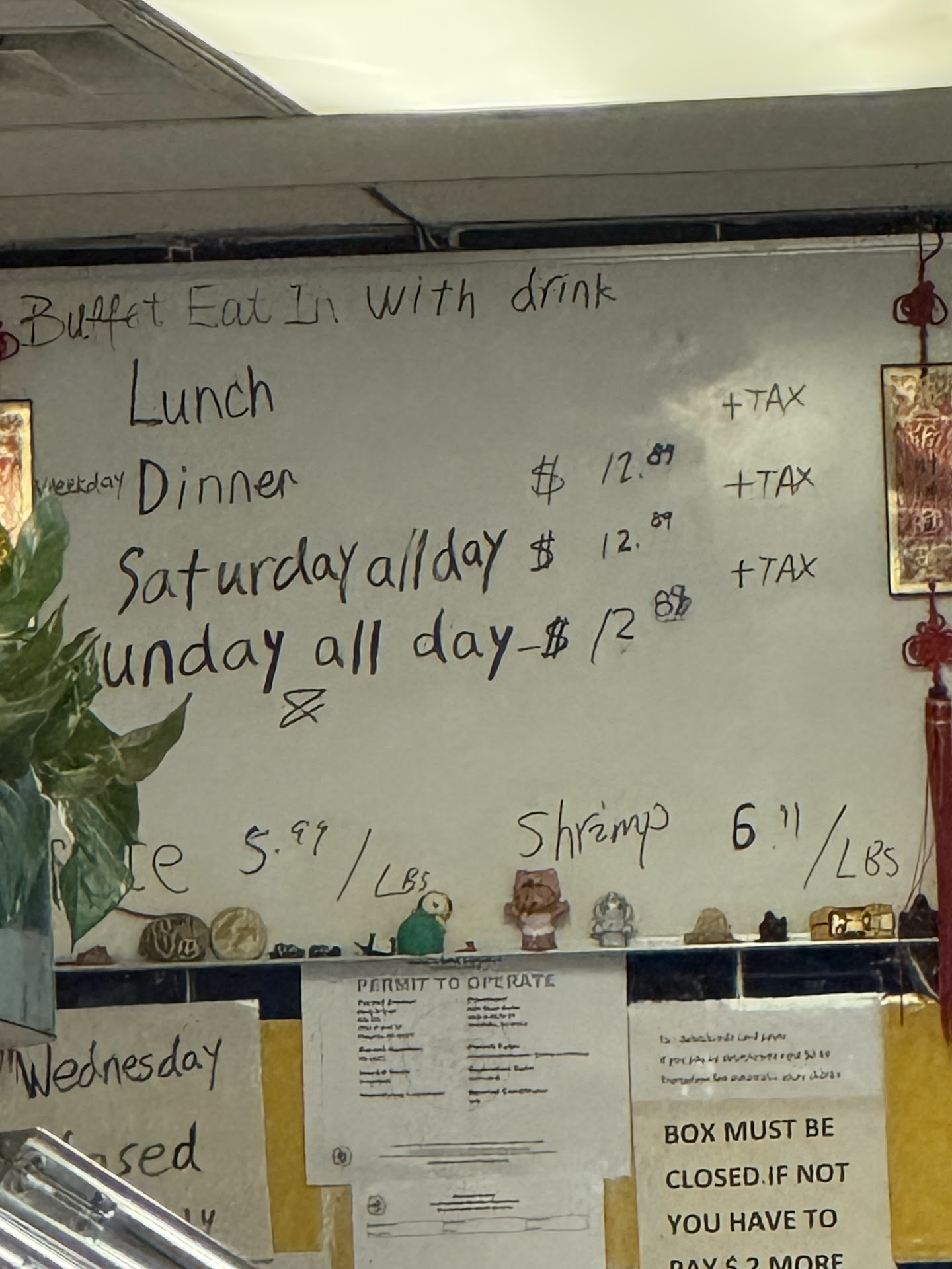 Oh, and another red flag was that the take out scale doesn’t show us (the customer) how much the take out weighs. It’s not printed on your receipt nor do they announce how much it weighs. The guy ringing us out didn’t really speak at all and wasn’t very courteous. I’ve never been to a Chinese buffet that wasn’t transparent about the weight and didn’t show you how much your food weighs.