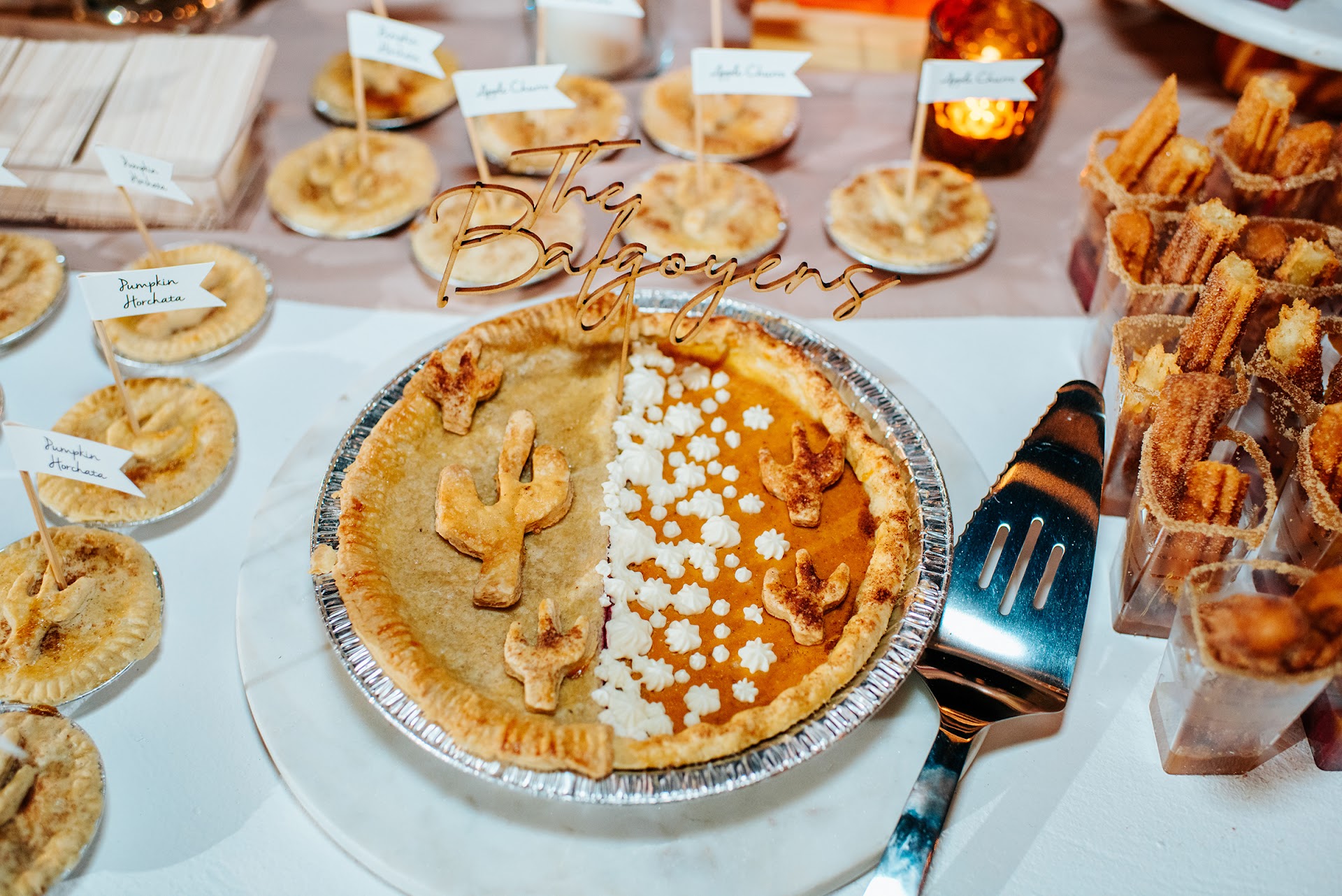 When my husband and I got married we knew we wanted to have pies as our main dessert. We were so lucky to find Monica at Only Pies! She was eager to help make all of our pie dreams come true down to the very last detail and didn't even bat an eyelash at our custom pie filling requests of 'Pumpkin Horchata' and 'Apple Churro' for our 3" mini pies for our guests! We were able to do a tasting beforehand and were super impressed at the flavors and consistency of the crust. We loved that she incorporated the saguaro cactus design into each of our pies to help fit the theme of our desert wedding, and were so impressed she has able to do a split bride and groom pie (half raspberry, half pumpkin horchata). There was a mix up the night before the wedding on a design detail and Monica was so so sweet to stay up late making sure everything was perfect for our wedding. Thank you again for the delicious & one of a kind pies, and for excellent customer...